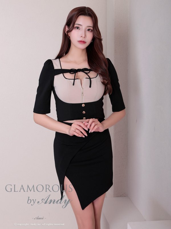【Andy GLAMOROUS/アンディグラマラス】バイカラー/ デコルテリボン/ バストジップ/ 半袖/ 袖あり/ ストレッチ/ アシンメトリー/ タイト/ セットアップ/ ミニドレス/ キャバドレス[OF05] [GMS-V856-BExB-2503]