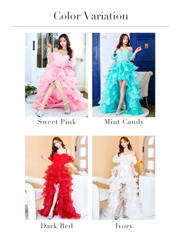 XLサイズあり【CLEO CLOE/ クレオ クロエ】パーティードレス/ ステージドレス/ イベントドレス/ フェザー/ フリル/ キャミソール/ 2way/ オフショル/ 袖付き/ テールカット/ フレア/ セットアップ/ ロングドレス long[OF05] [L60198LS-MICan-S2503]
