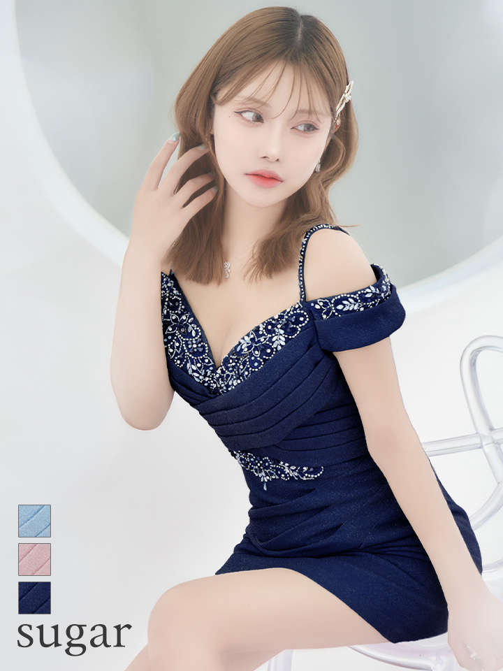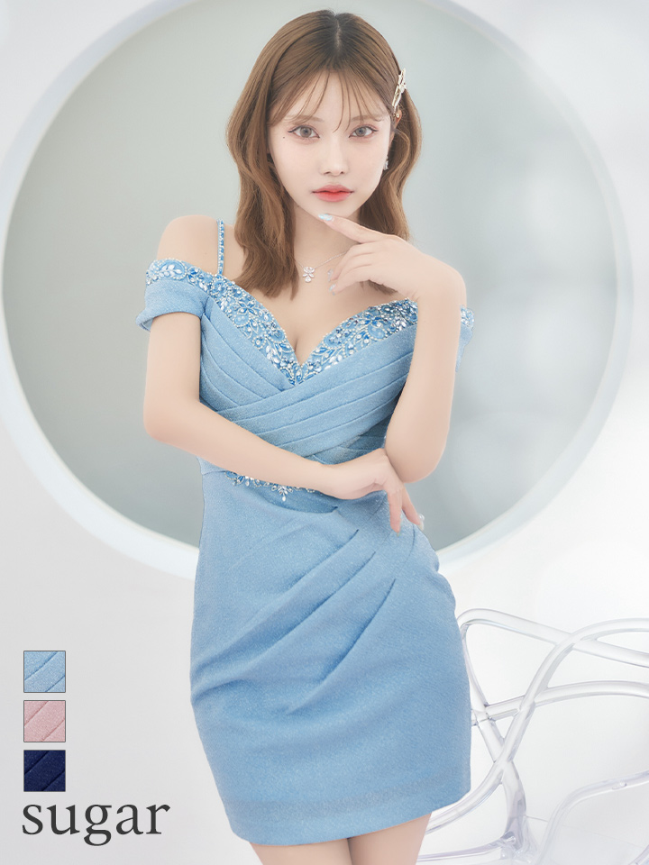 XSサイズあり【IRMA/イルマ】ラメニット/ ビジュー/ オフショル/ タック/ カシュクール/ ストレッチ/ タイト/ ミニドレス/ キャバドレス[OF2A] [51773-IR-DKBL-S250324]
