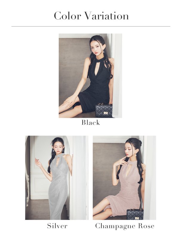 Lサイズあり【JEAN MACLEAN/ジャンマクレーン】ハイネック/ ラメニット/ ノースリーブ/ チェーンショルダー/ タック/ ひざ丈/ タイト/ ミディアムドレス/ キャバドレス【HC02】 [45016-JM-CHPRos-S2503]