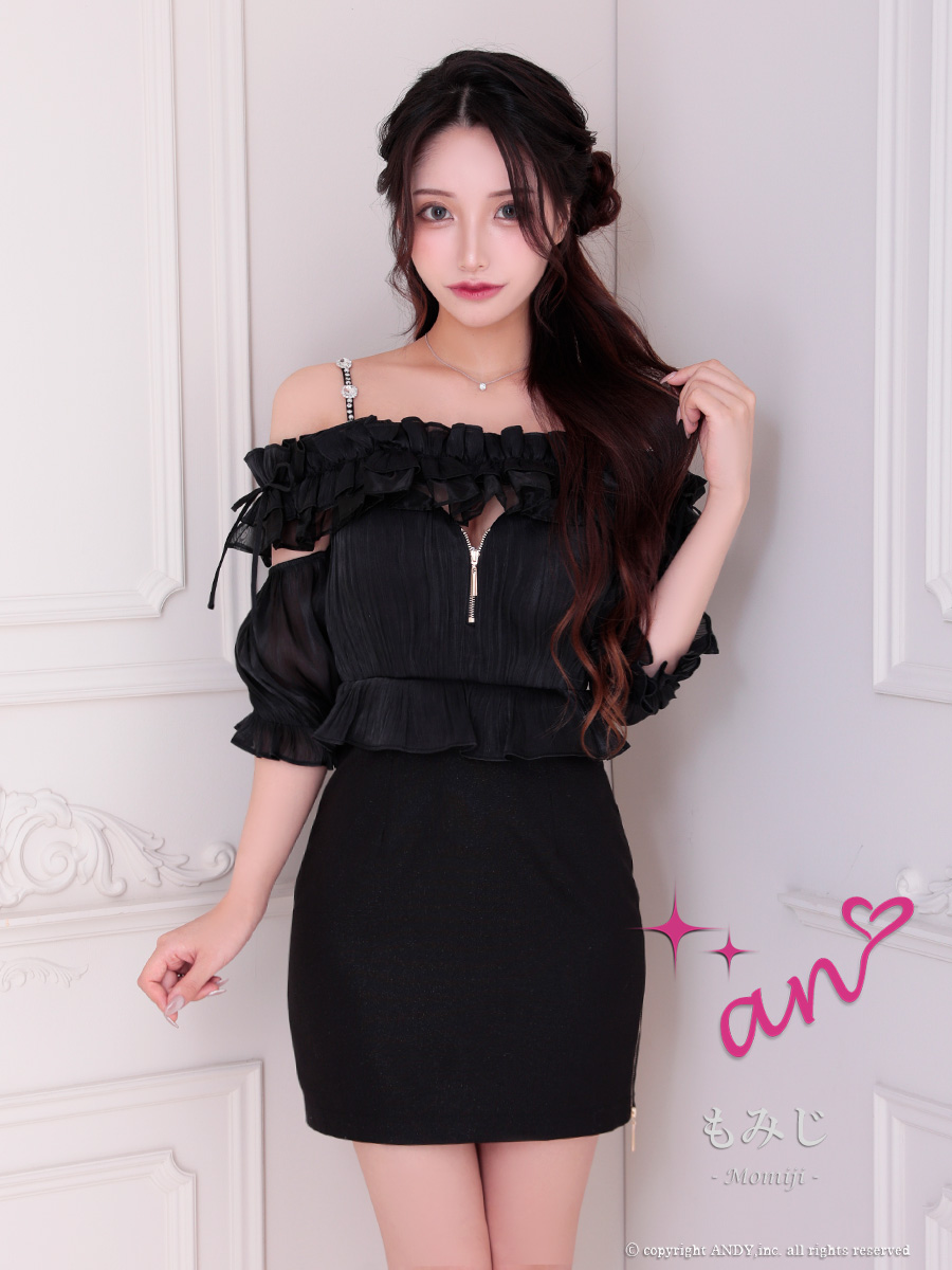 XSサイズあり【an /アン】ショルダービジュー/ フリル/ オフショル/ パフスリーブ/ バストジップ/ ペプラム/ タイト/ ミニドレス/ キャバドレス[OF05] [AOC3882-W-S250331]