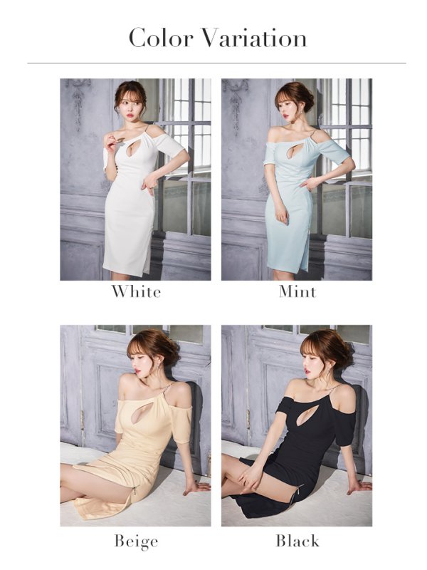 XSサイズあり【Veautt/ヴュート】【OF05】ワンショルダー/ アシンメトリー/ バストカット/ ショートスリーブ/ タイト/ ミディアムドレス/ キャバドレス [VT032504-W-S250426]