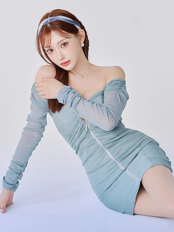 ラメチュールの透け感がかわいいオフショルミニドレス。