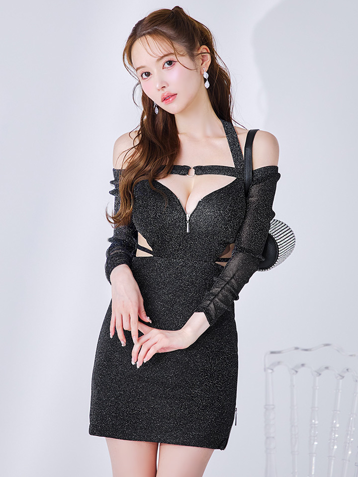 XSサイズあり【Andy GLAMOROUS/アンディグラマラス】ラメニット/ ホルター/ オフショル/ ロングスリーブ/ 袖あり/ カットアウト/ ウエストシアー/ タイト/ ミニドレス/ キャバドレス[OF05] [GMS-V868-B-S250509]