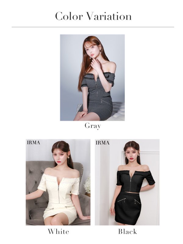 XSサイズあり【IRMA/イルマ】オフショル/ フロントジップ/ ラインストーン/ ビジュー/ ハーフスリーブ/ タイト/ セットアップ/ ミニドレス/ キャバドレス[OF2A] [55057-IR-GY-S250523]