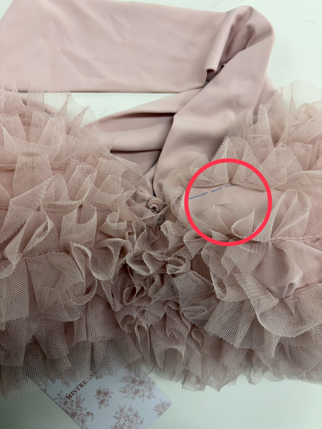 ■不良内容:トップスの左胸の内側チュール下の生地部分に製造時のチャコペン跡(青い線)が残っています。