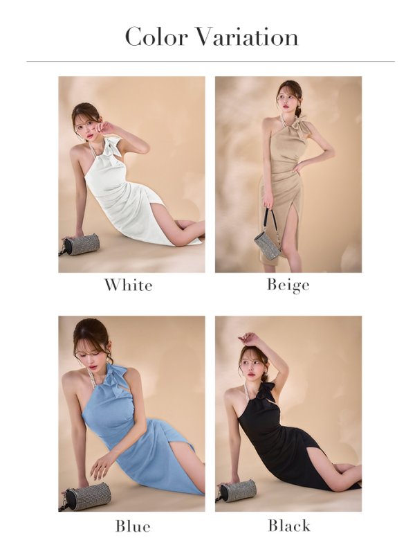 XSサイズあり【Veautt/ヴュート】【OF05】ホルターネック/ タック/ リボン/ パールスカーフ/ タイト/ ミディアムドレス/ キャバドレス [VT082514-W-S250620]