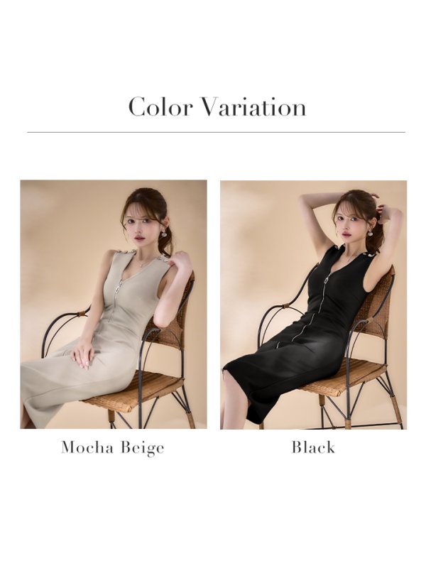 XSサイズあり【Veautt/ヴュート】【OF05】フロントファスナー/ ウエストタック/ ボタン/ タイト/ ミディアムドレス/ キャバドレス [VT092501-MochaBE-S250620]