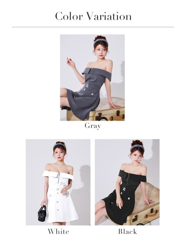 XSサイズあり【ANDY/アンディ】オフショルダー/ フロントジップ/ ベルト/ ビジューボタン/ ストレッチ/ フレア/ ミニドレス/ キャバドレス[OF05] [ON2931-GY-S250628]
