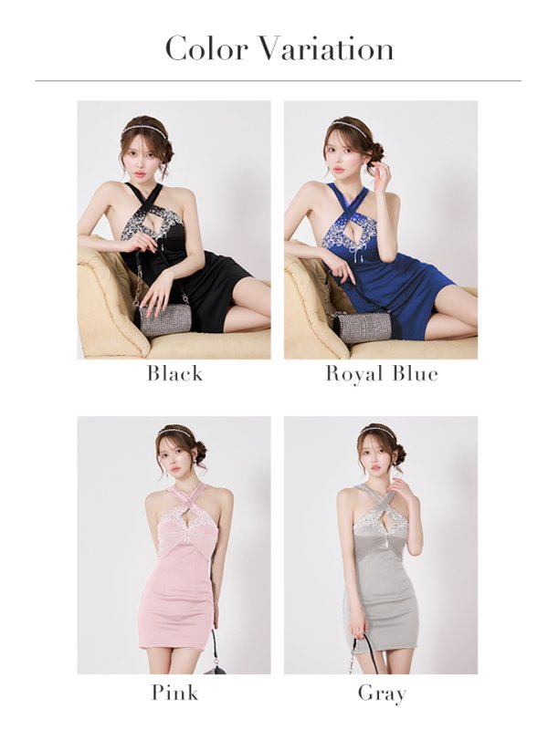 デコルテ部分はクロスストラップデザインで、肌見せしつつも上品な印象をキープし、女性らしさを引き立てます。