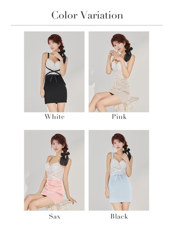 ウエストのクロスデザインとリボンがスタイルアップ効果を演出し、デコルテを美しく魅せるVカットがポイント。