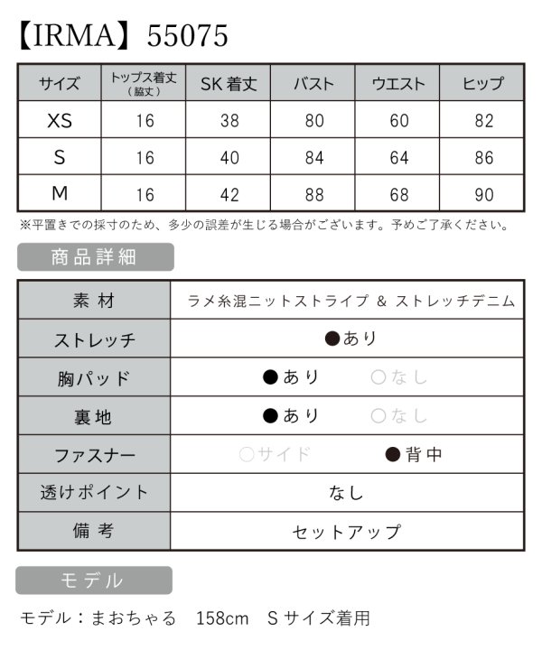 B:84 / W:64 / H:86 [着丈]トップス(脇下):約16cm スカート丈:約40cm |