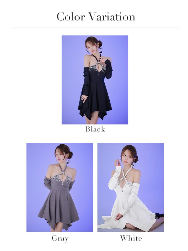 XSサイズあり【an /アン】 2WAY/ ロングスリーブ付き/ クロスホルターネック/ ビジュー/ バストジップ/ 変形ヘム/ フレア/ ミニドレス/ キャバドレス[OF05] [AOC3947-W-S250724]