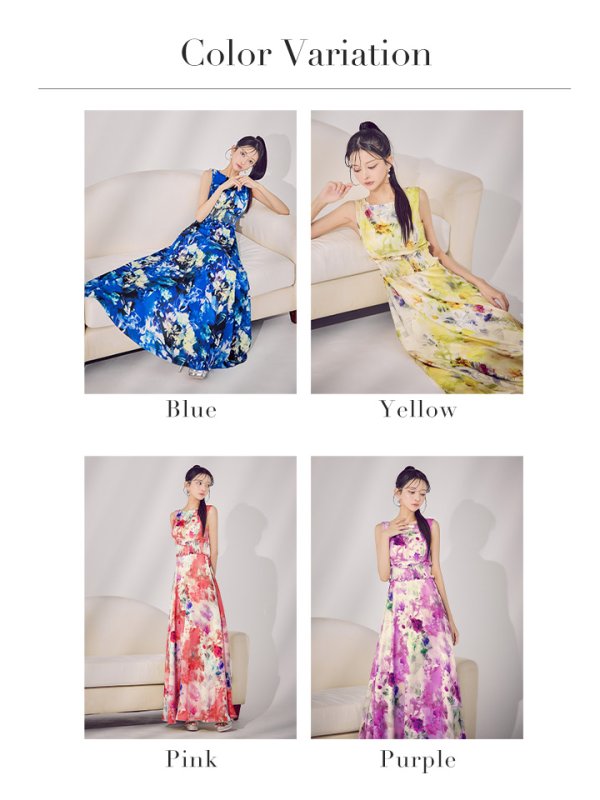 彩度の高いフラワープリントが視線を集めるフレアロングドレス♡