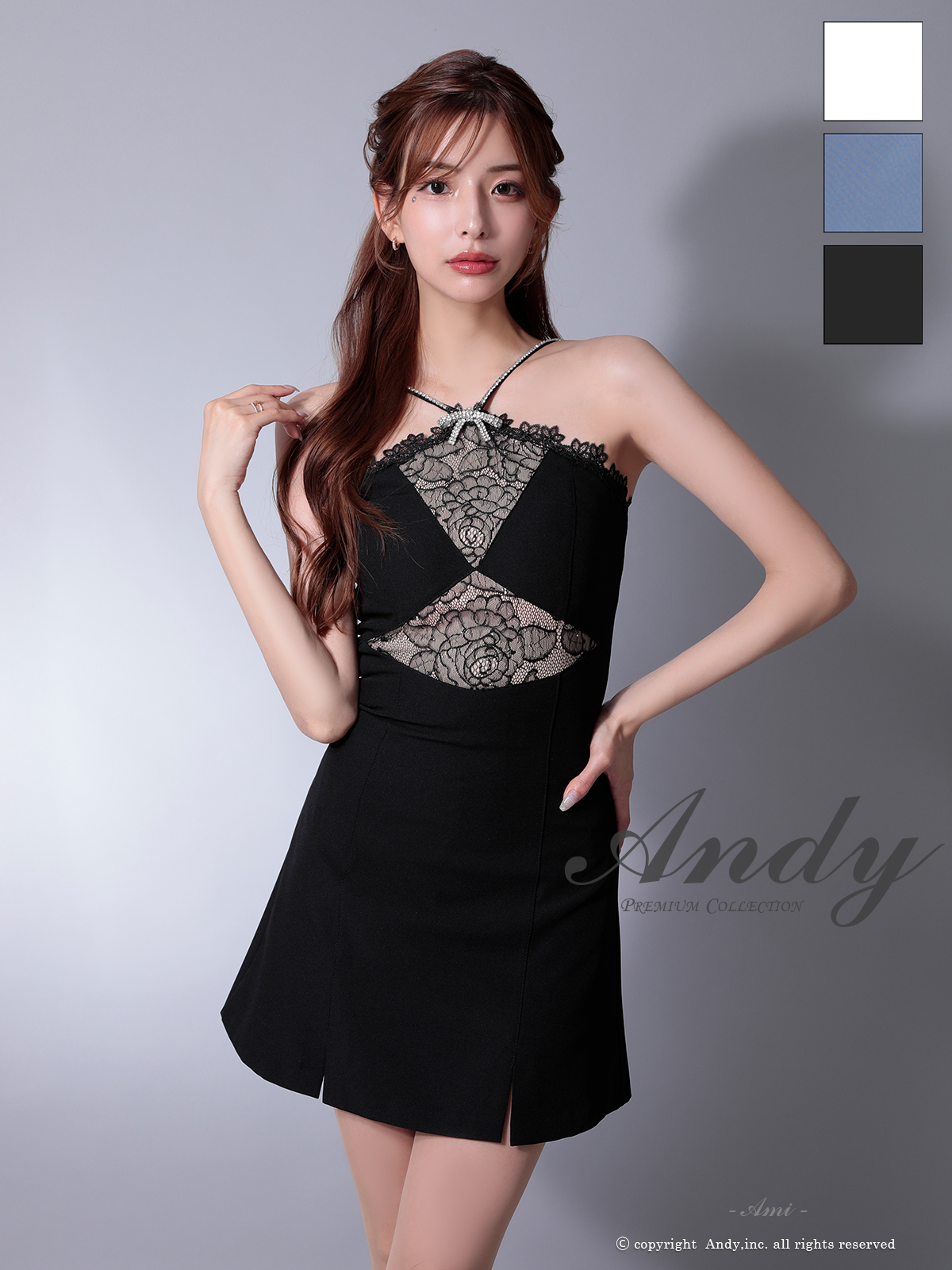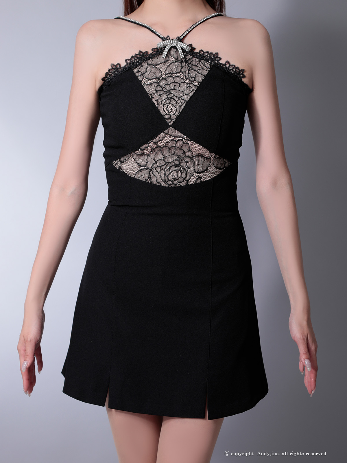 XSサイズあり【ANDY/アンディ】ビジューリボン/ ホルターネック/ レース/ 切替/ ストレッチ/ フレア/ ミニドレス/ キャバドレス[OF05] [OK2961-W-2507]