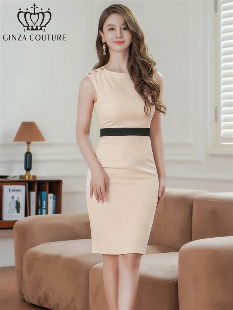 XS-Lサイズあり【GINZA COUTURE/銀座クチュール】シンプル/ バイカラー/ 切替/ ノースリーブ/ ボタン/ スリット/ タイト/ 膝丈/ ミディアムドレス/ キャバドレス[OF2 [LKC25051-BE-2508]