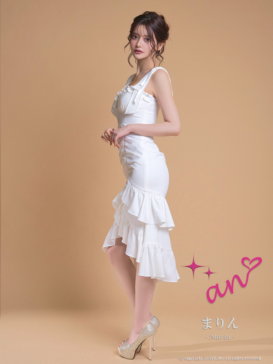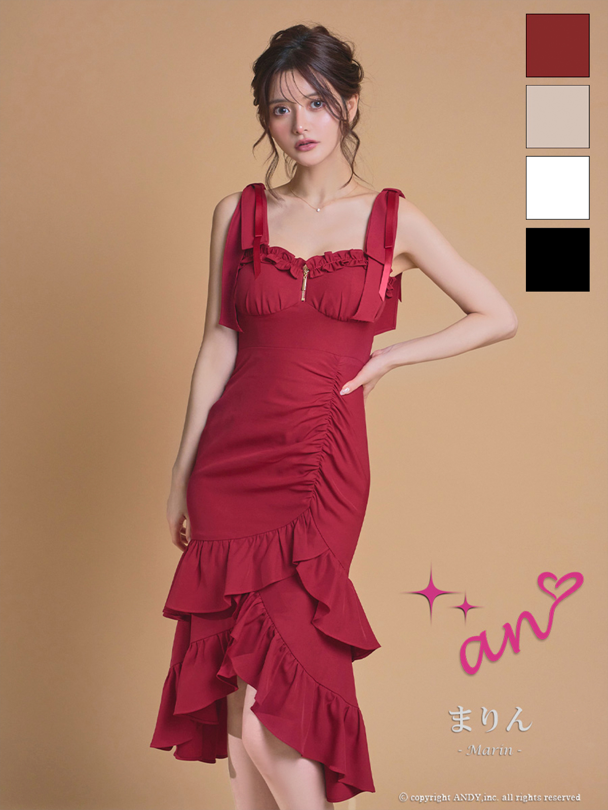 XSサイズあり【an/アン】ショルダーリボン/ バストジップ/ ノースリーブ/ フリル/ フレア/ ミディアムドレス/ キャバドレス[OF05] [AOC3972-BE-2509]