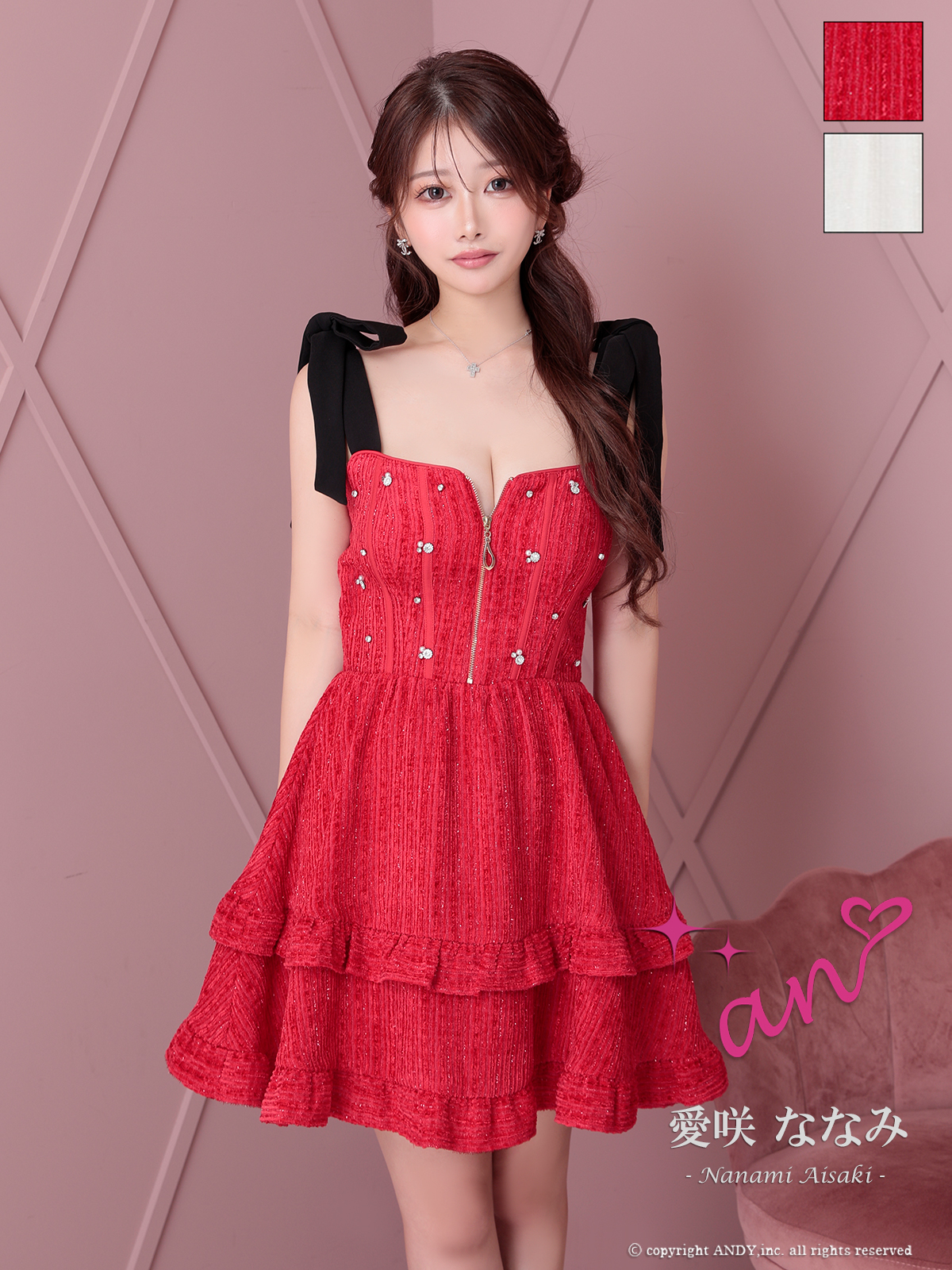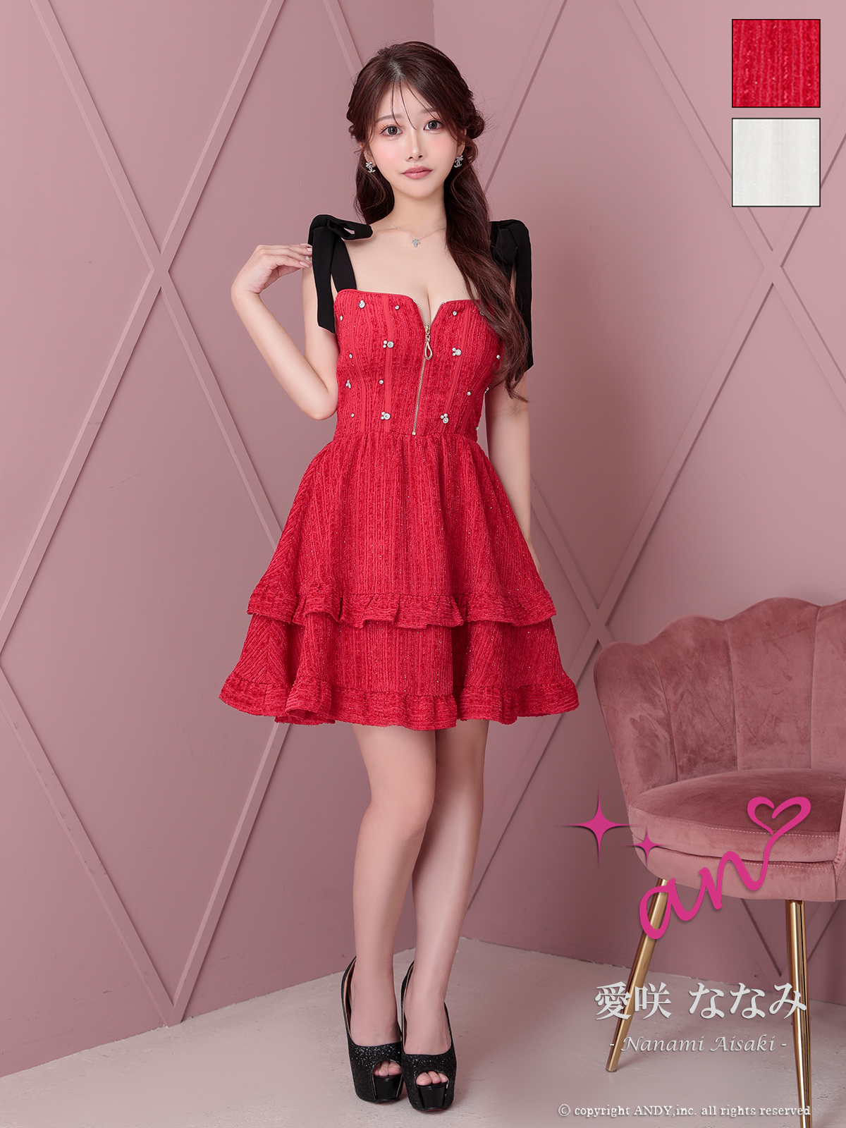 XSサイズあり【an /アン】バイカラー/ ショルダーリボン/ フロントジップ/ ビジュー/ ノースリーブ/ フリル/ フレア/ ミニドレス/ キャバドレス[OF05] [AOC3983-BxR-2509]