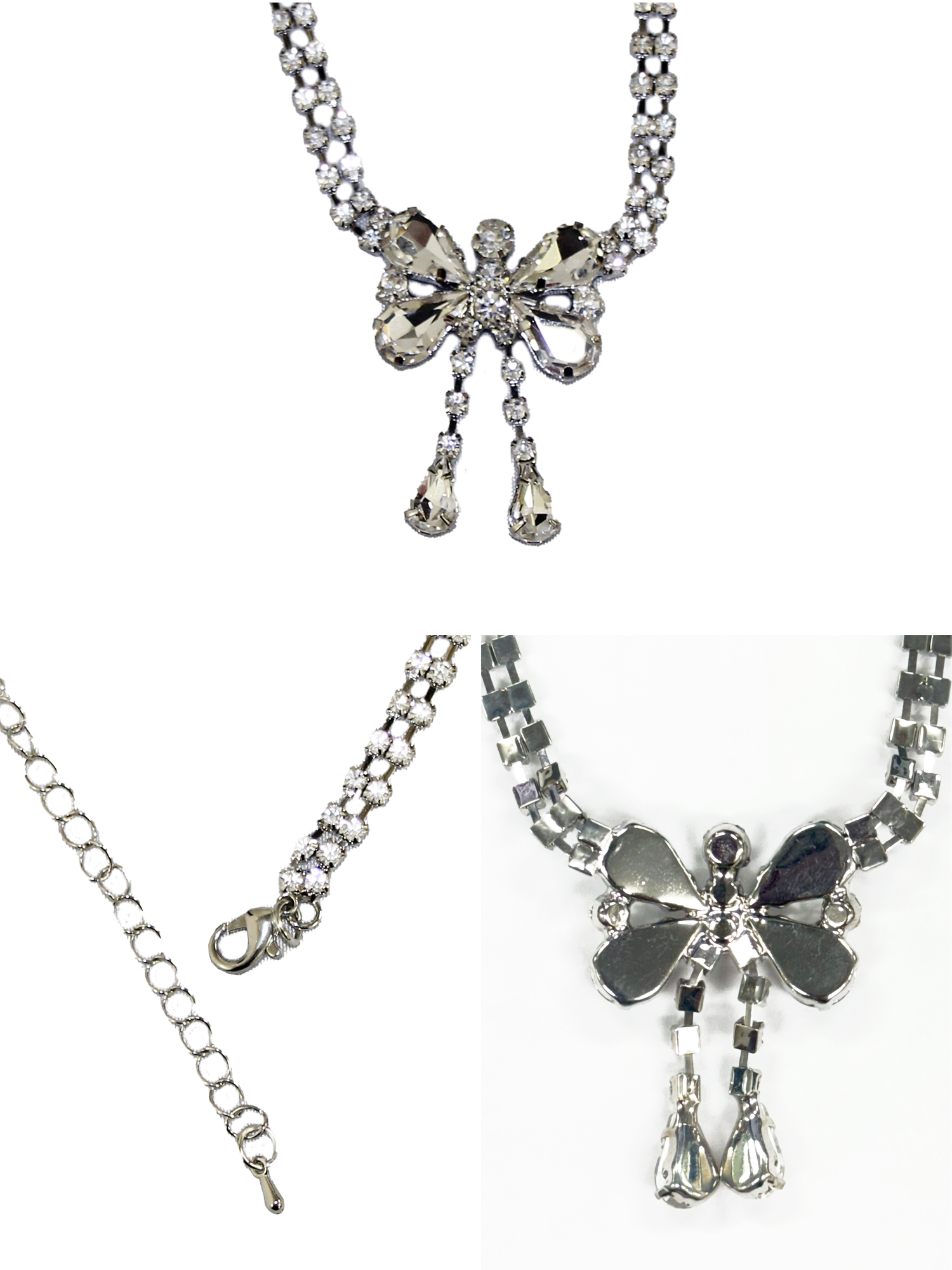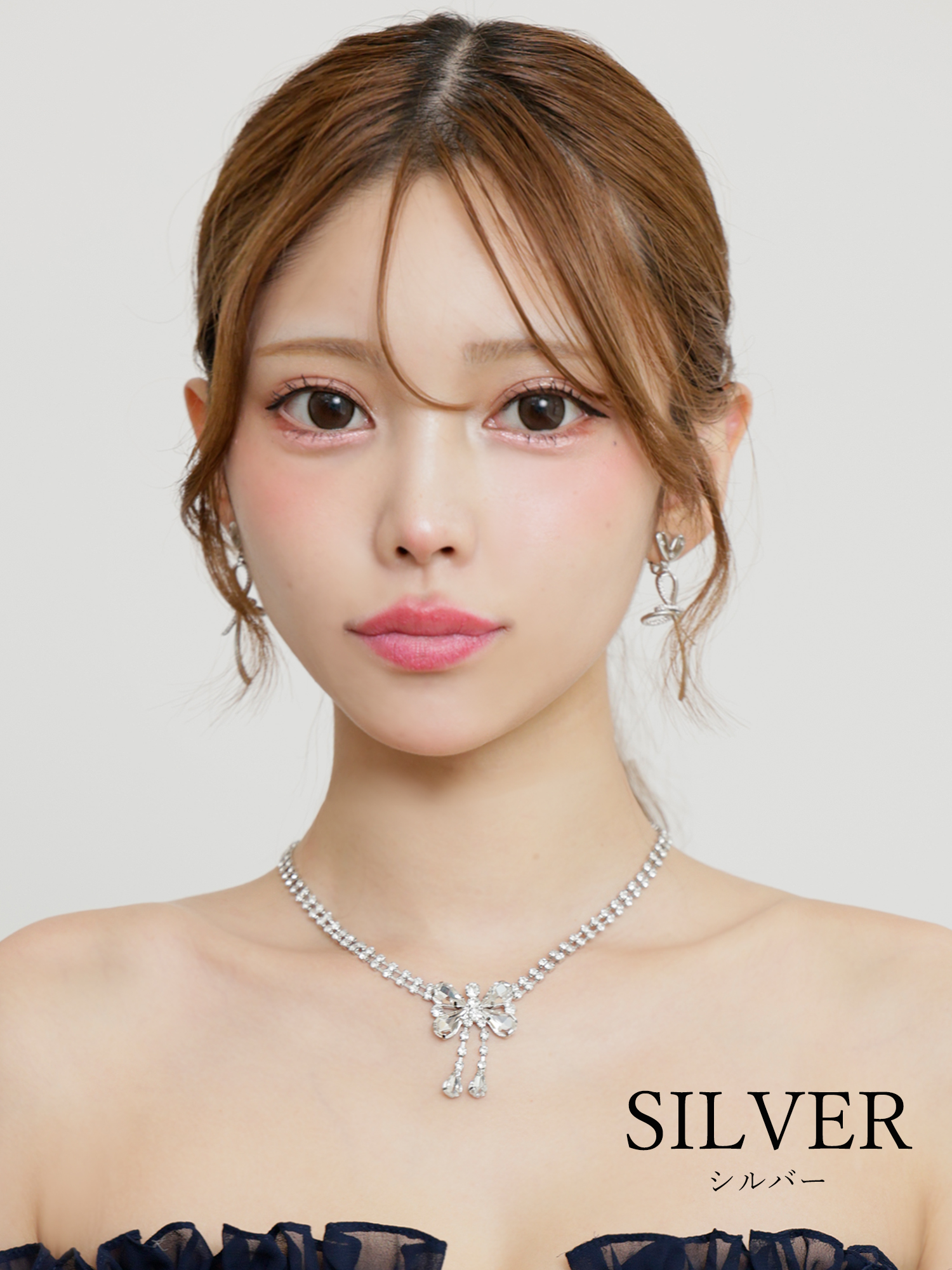 エレガントなリボンモチーフが胸元を華やかに彩る、煌めくビジューネックレス。