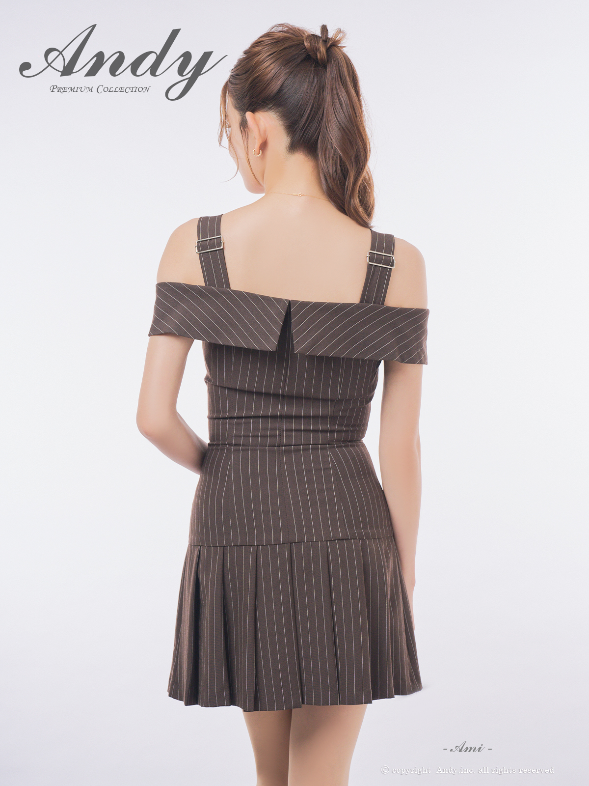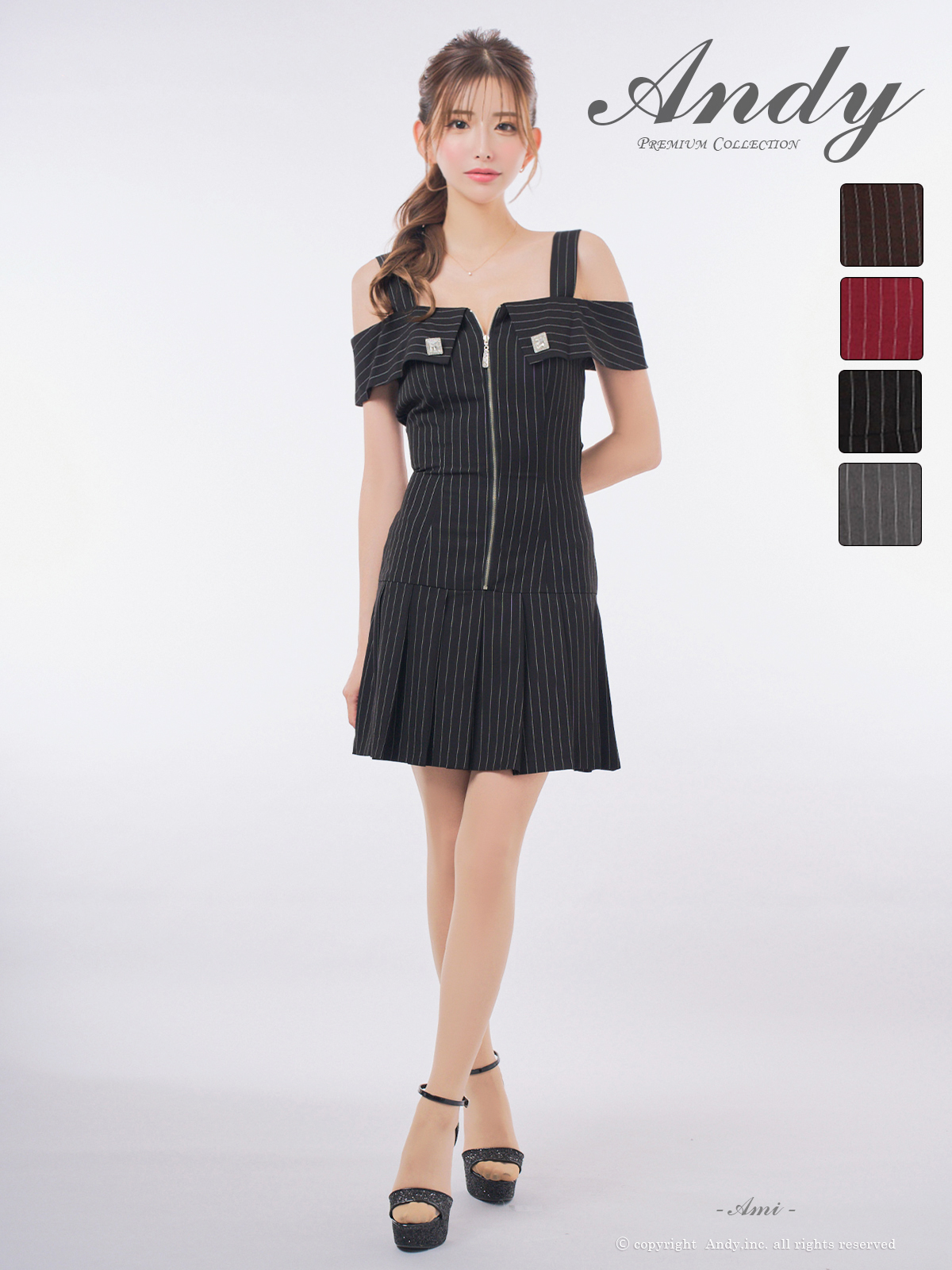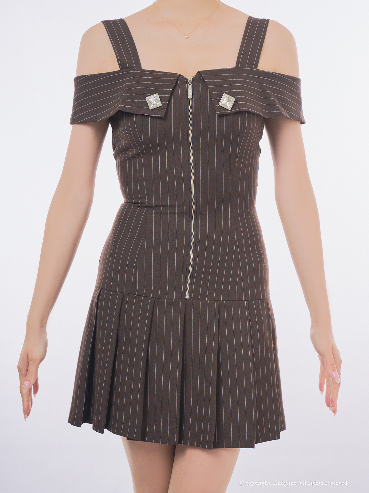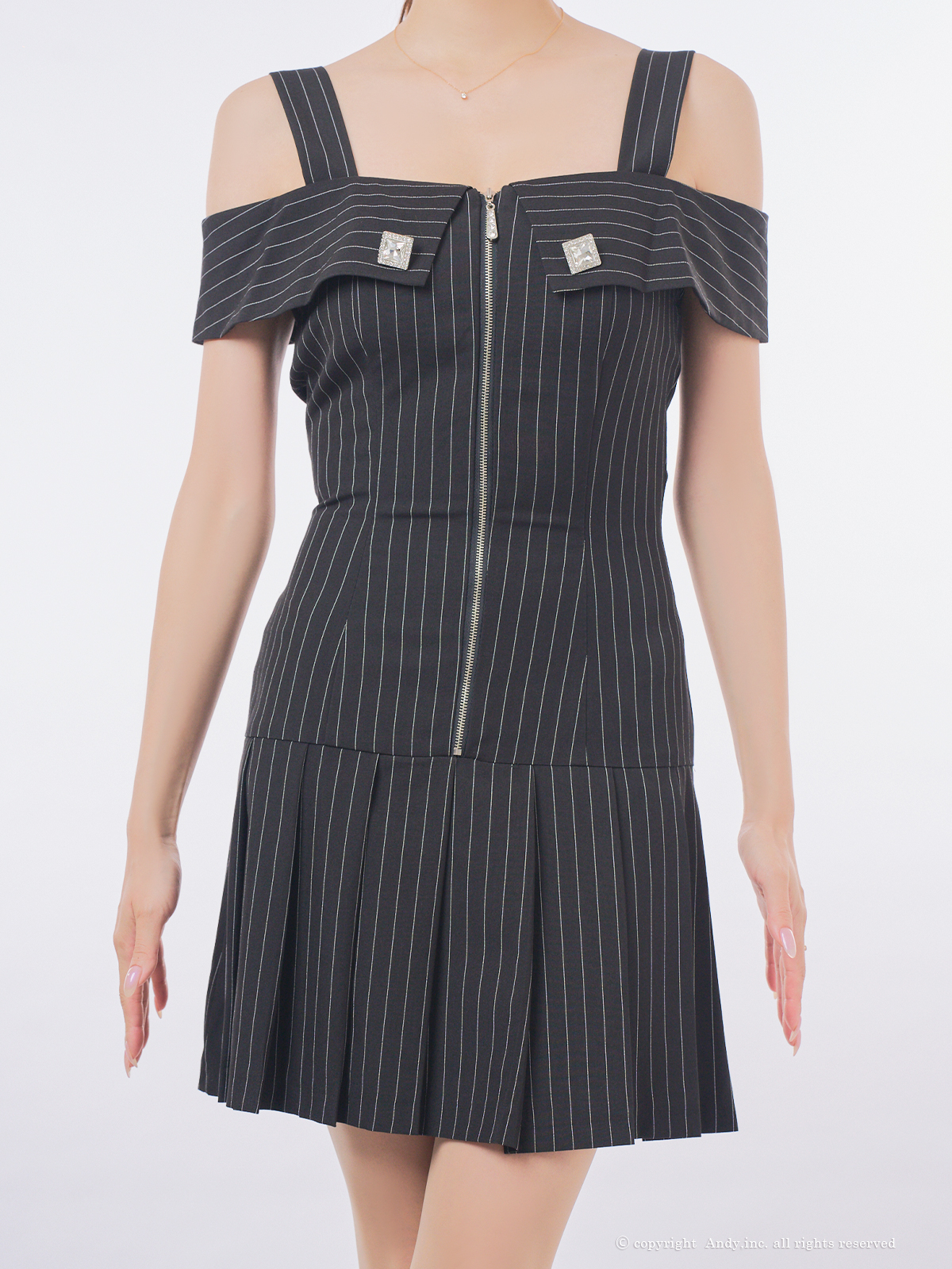 XSサイズあり【ANDY/アンディ】オフショル/ ストライプ/ フロントジップ/ ビジュー/ プリーツ/ Aライン/ フレア/ ワンピース/ ミニドレス/ キャバドレス[OF05] [OK3005-B-2509]