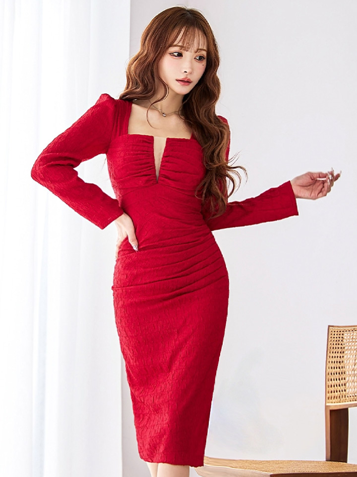 Lサイズあり【VANESSA HEART / ヴァネッサハート】【OF05】スクエアネック/ 長袖/ 袖あり/ タック/ひざ丈/ タイト/ ワンピース/ ミディアムドレス/ キャバドレス [H60179H-BE-S2510]