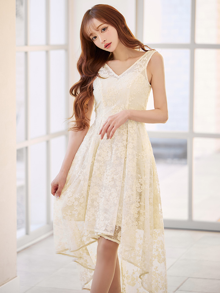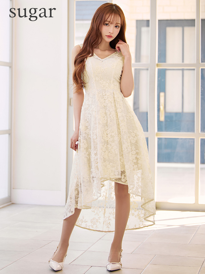 XS-Lサイズあり【SETTAN/セッタン】総レース/ フラワー刺繍/ スパンコール/ Vネック/ ノースリーブ/タック/ フィッシュテール/ Aライン/ ミディアムドレス/ キャバドレス[OF2] [LKS25101-IV-S2510]
