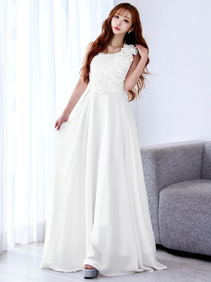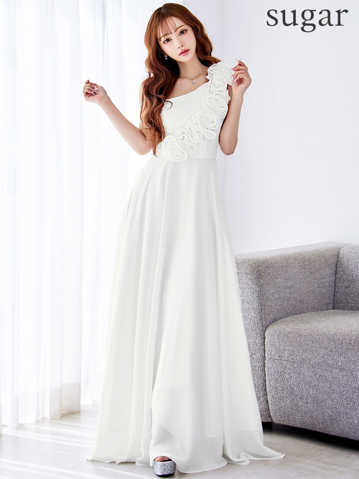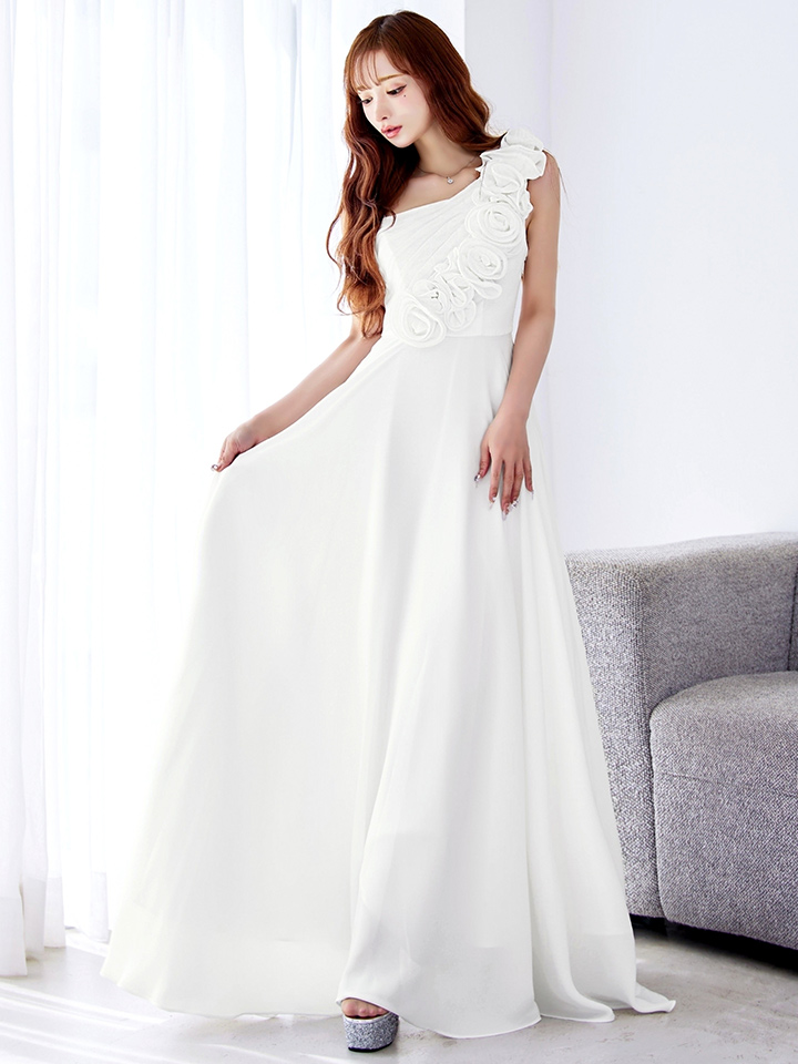 Lサイズあり【CLEO CLOE/ クレオ クロエ】パーティードレス/ ステージドレス/ イベントドレス/ 立体フラワーフリル/ アシメショルダー/ ノースリーブ/ Aライン/ フレア/ ロングドレス long[OF05] [L9846L-IV-S2510]