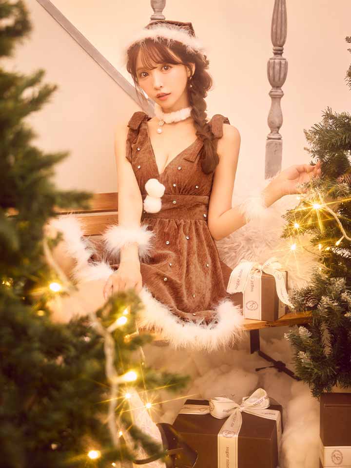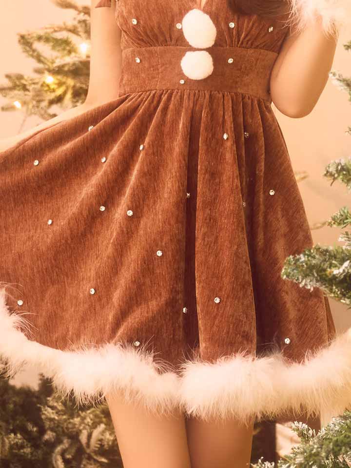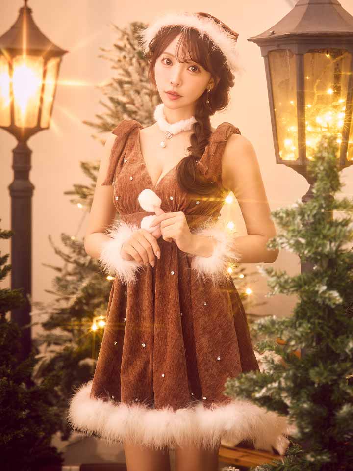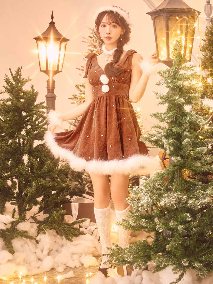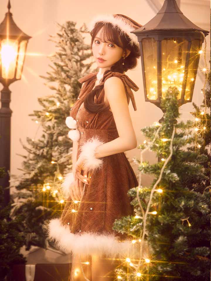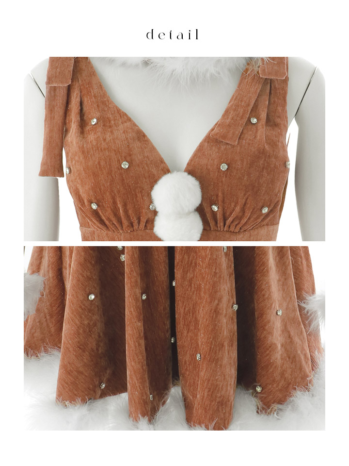 ブラウン クリスマス ブラウンビジュー ベロア ドレス ファー付きワンピース キャバドレスクリスマス イベントドレス