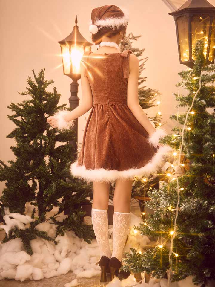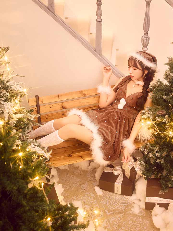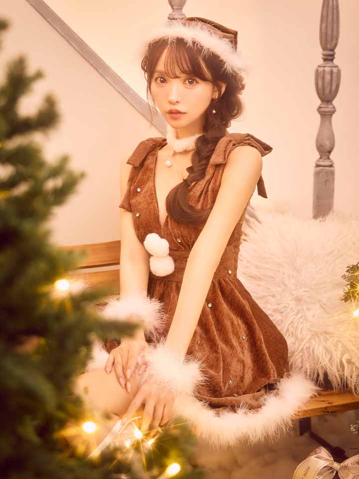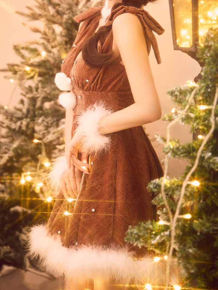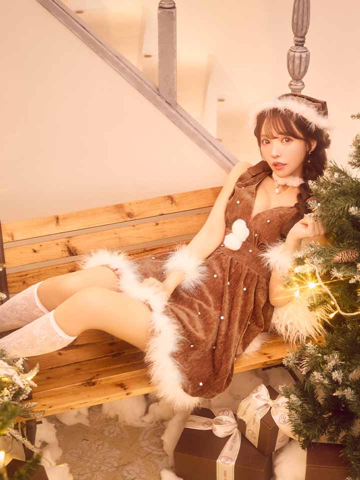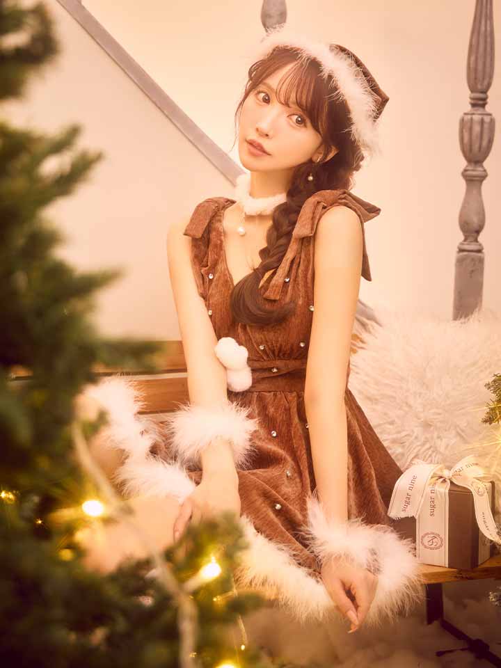 ブラウン クリスマス ブラウンビジュー ベロア ドレス ファー付きワンピース キャバドレスクリスマス イベントドレス