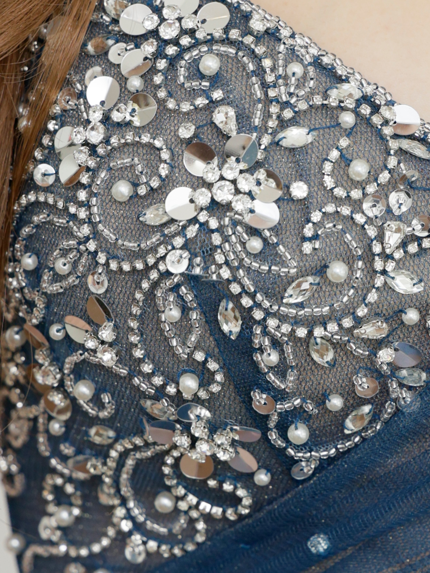 胸元に繊細なビジュー刺繍をあしらい、華やかな印象を引き立てるデザイン。