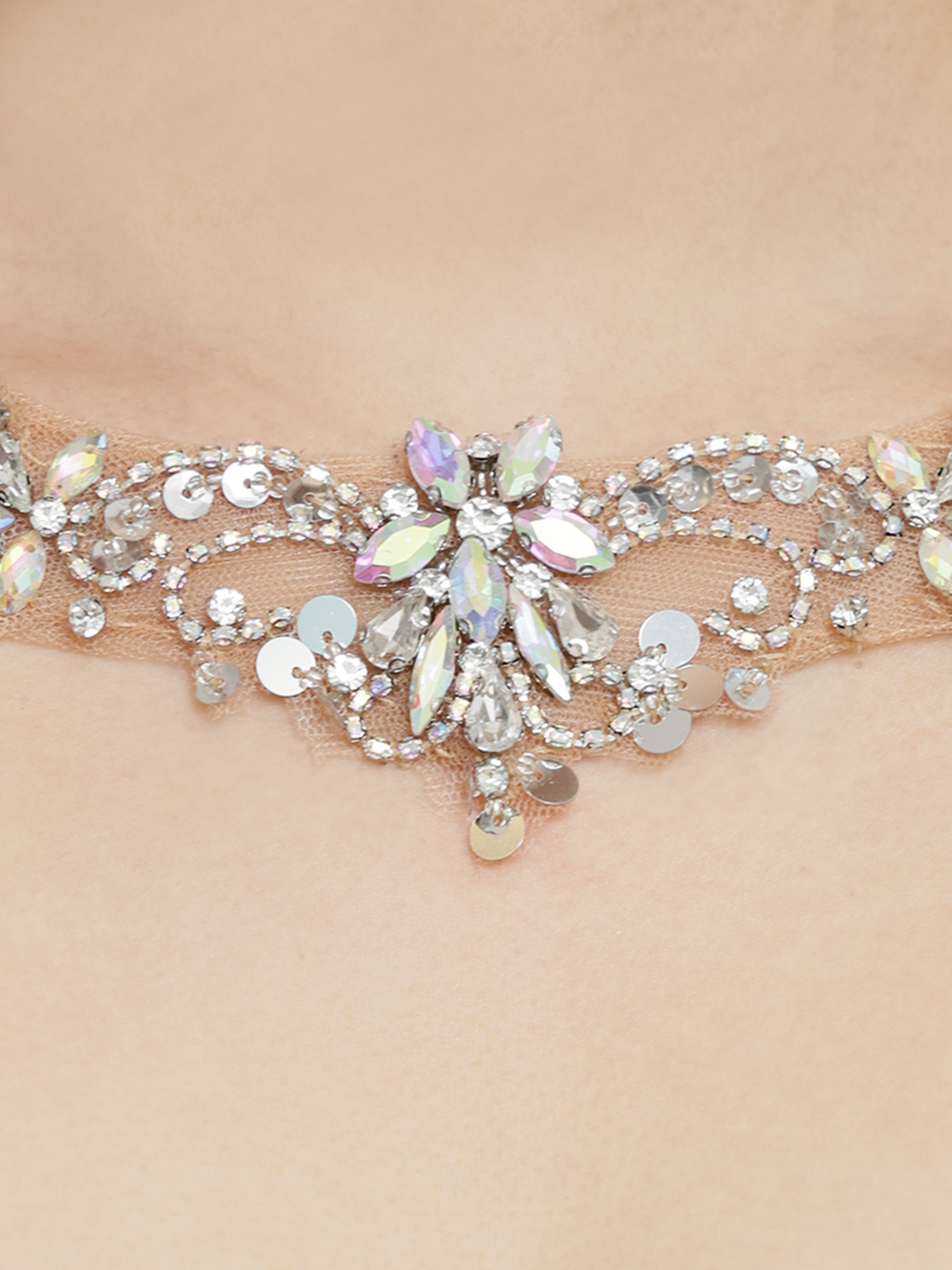 きらめく装飾が目を惹く胸元デザインで、洗練された存在感を放ちます。