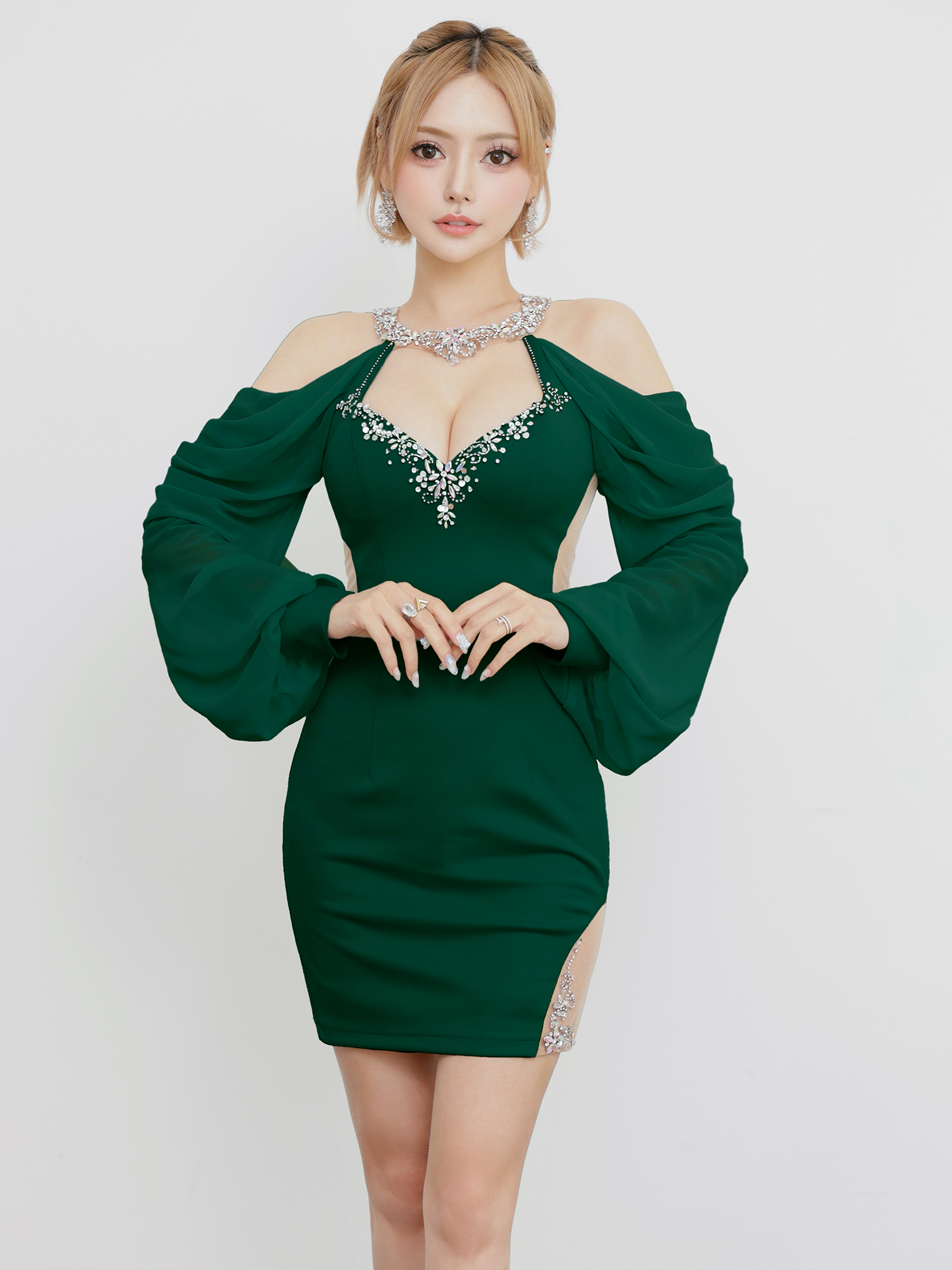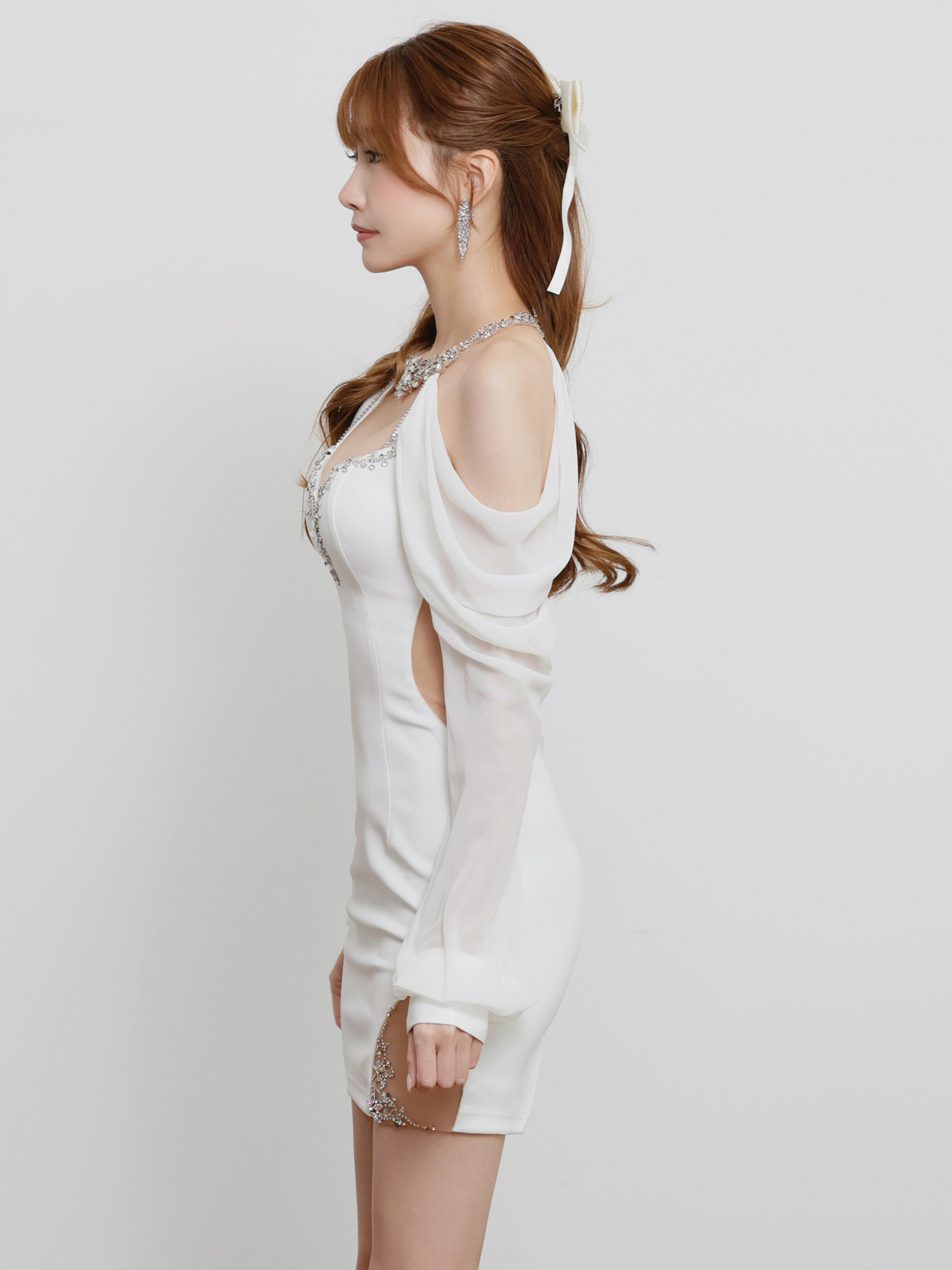 XSサイズあり【ANGEL R/エンジェルアール】アメスリ/ ロングスリーブ/ シフォン/ ビジュー/ ショルダーカット/ メッシュ/ タイト/ ミニドレス/ キャバドレス[OF2] [AR25862-W-S251003]