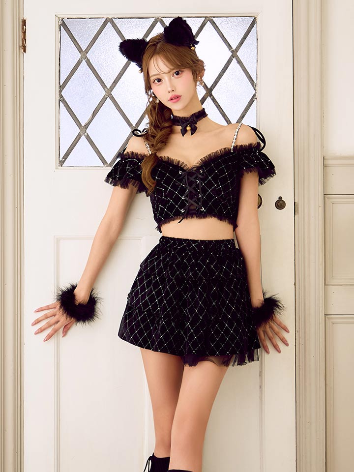 【即日発送】【ハロウィン】キャットオフショルビジューセットアップ【コスプレ6点セット】【XS-Lサイズ/3カラー】[OF04/OF03] [HW-211-YN-dzw-B-25RP]
