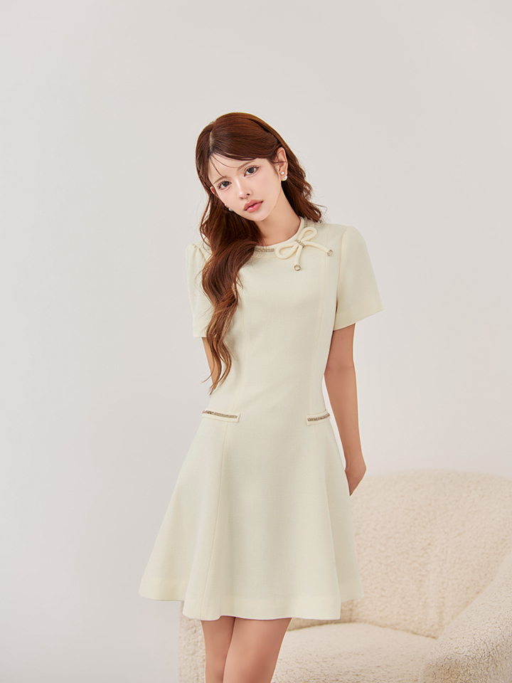 XS-Lサイズあり 【GINZA COUTURE/銀座クチュール】ネックリボン/ 半袖/ 袖あり/ ラインストーン/ フェイクポケット/ フレア/ Aライン/ ワンピース/ ミニドレス/ キャバドレス[OF2] [LKC37301-IV-S251006]