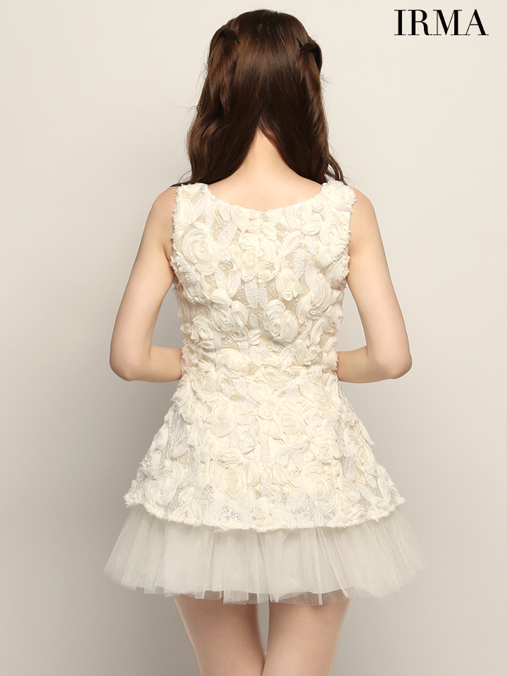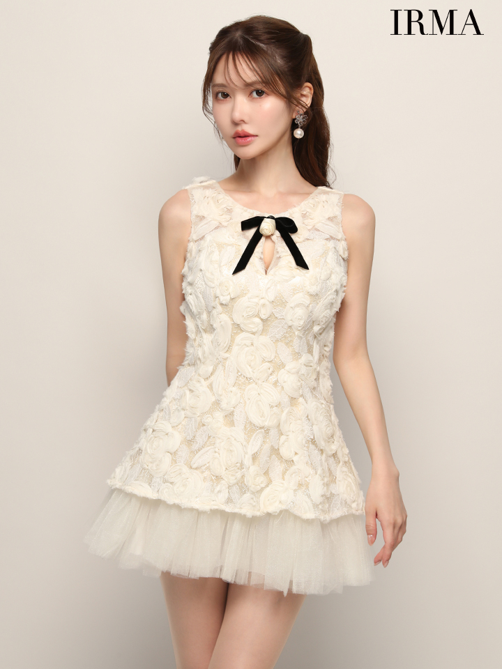 XSサイズあり【IRMA/イルマ】リボンブローチ付き/ 立体フラワー/ チュールフリル/ ノースリーブ/ フレア/ ミニドレス/ キャバドレス[OF2A]【一部予約商品/10月下旬発送予定】 [51936-IR-Vanilla-2510]