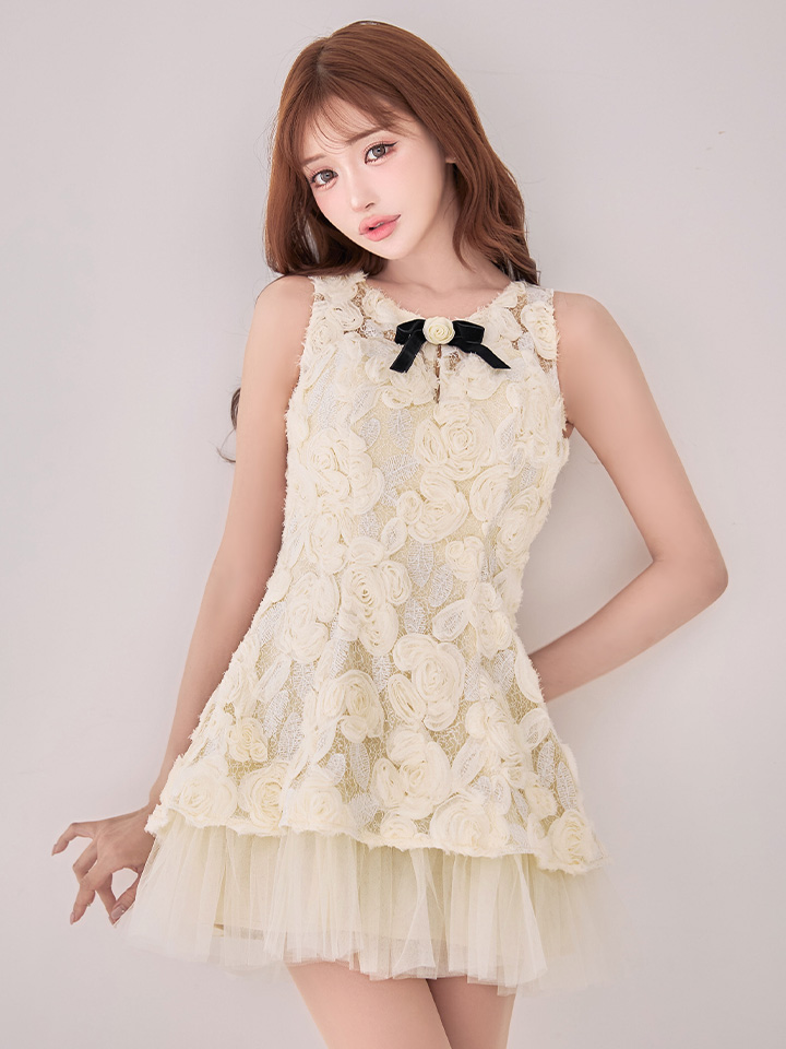 XSサイズあり【IRMA/イルマ】リボンブローチ付き/ 立体フラワー/ チュールフリル/ ノースリーブ/ フレア/ ミニドレス/ キャバドレス[OF2A]【一部予約商品/10月下旬発送予定】 [51936-IR-Vanilla-S251006]