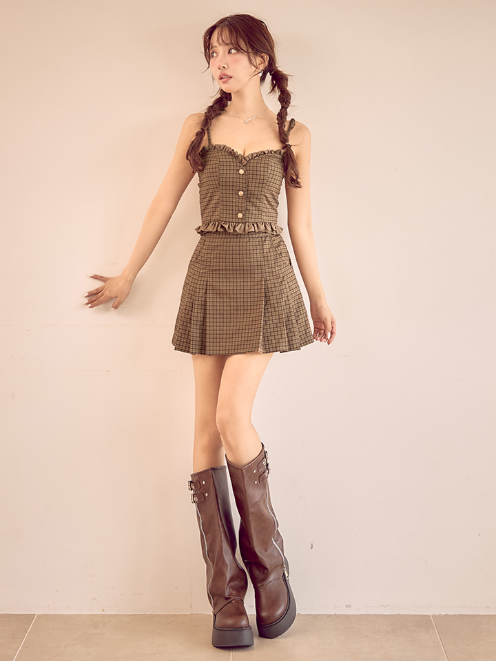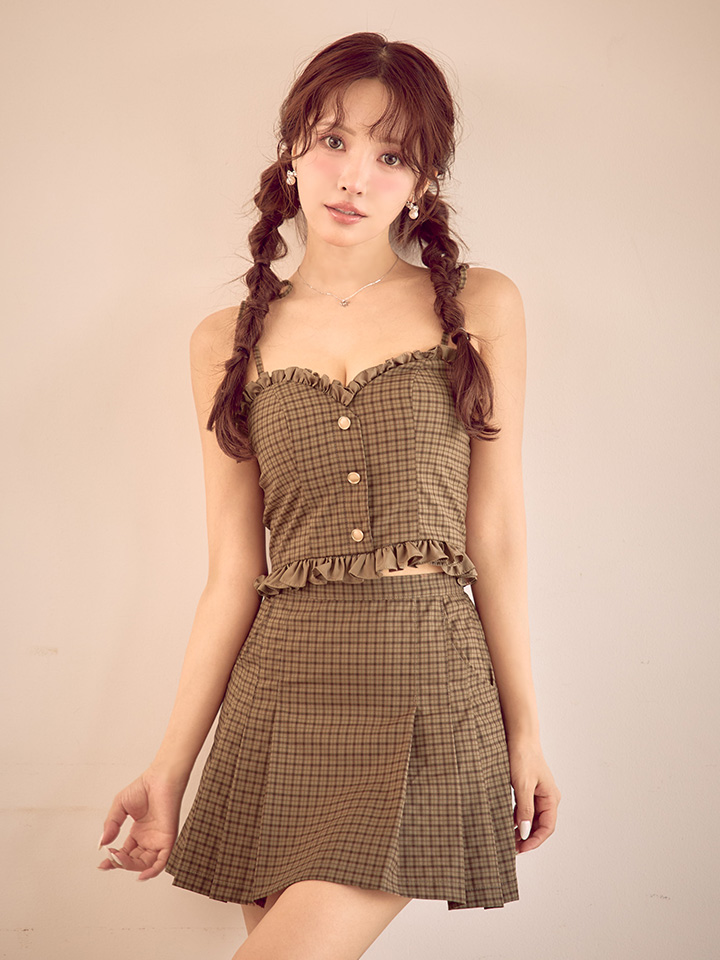 【予約商品/10月上旬-10月中旬発送予定】XSサイズあり【ANGEL R/エンジェルアール】ベアトップ/ 2way/ フリル/ チェック/ フロントボタン/ プリーツ/ フレア/ マイクロミニドレス/ キャバドレス[OF2] [AR25341-BR-S251008]