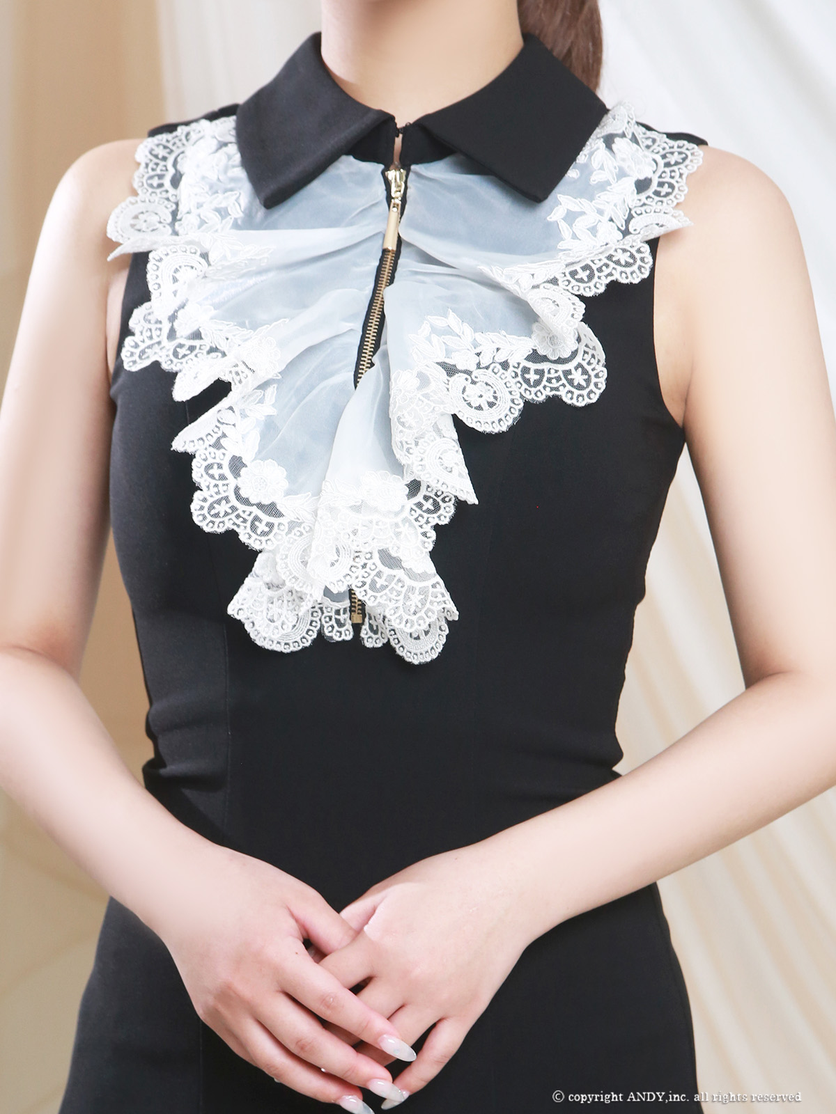 XSサイズあり【an/アン】襟付き/ フロントジップ/ レース/ フリル/ スカラップ/ ノースリーブ/ ストレッチ/ フレア/ ミニドレス/ キャバドレス[OF05] [AOC3995-BE-2510]
