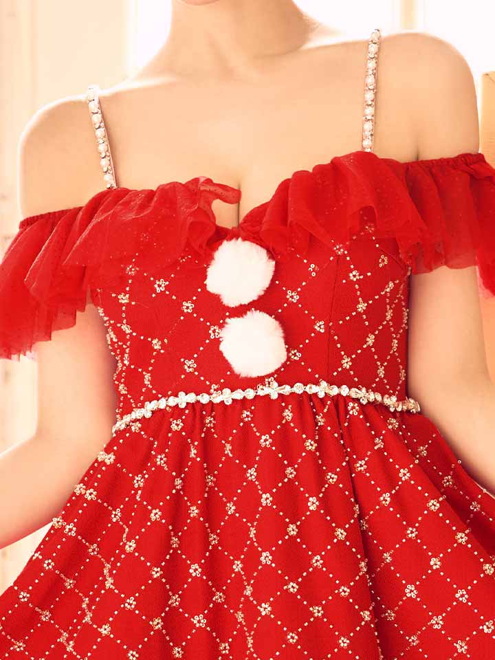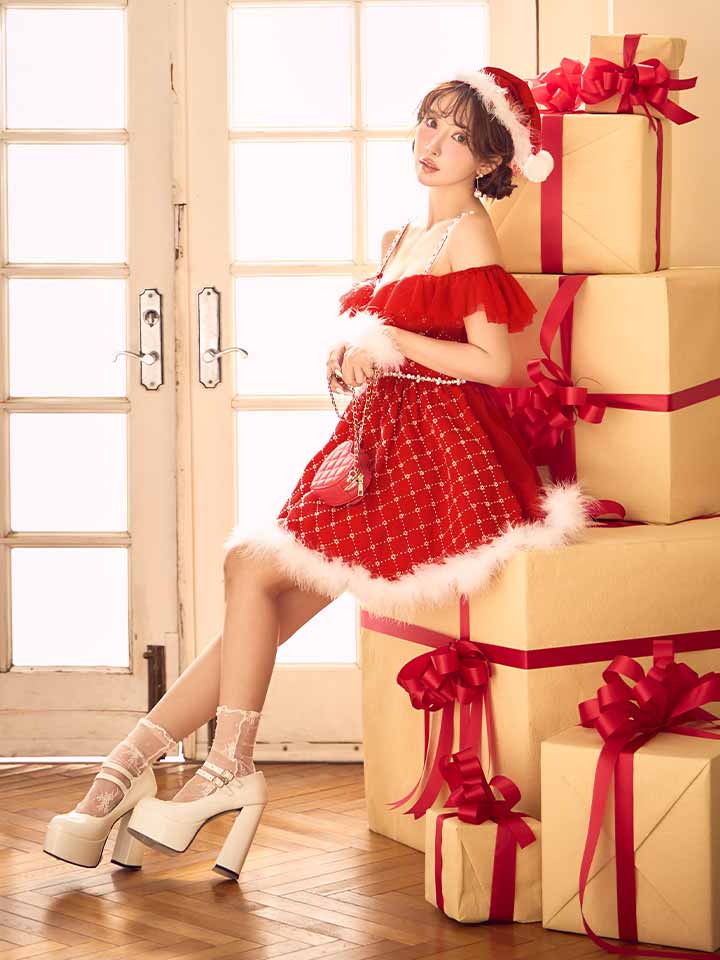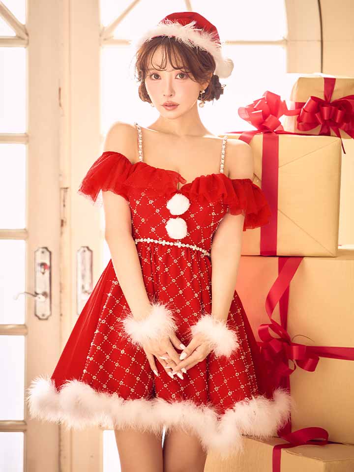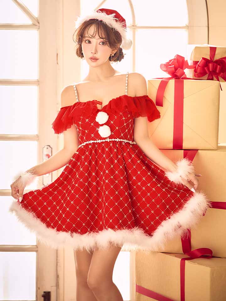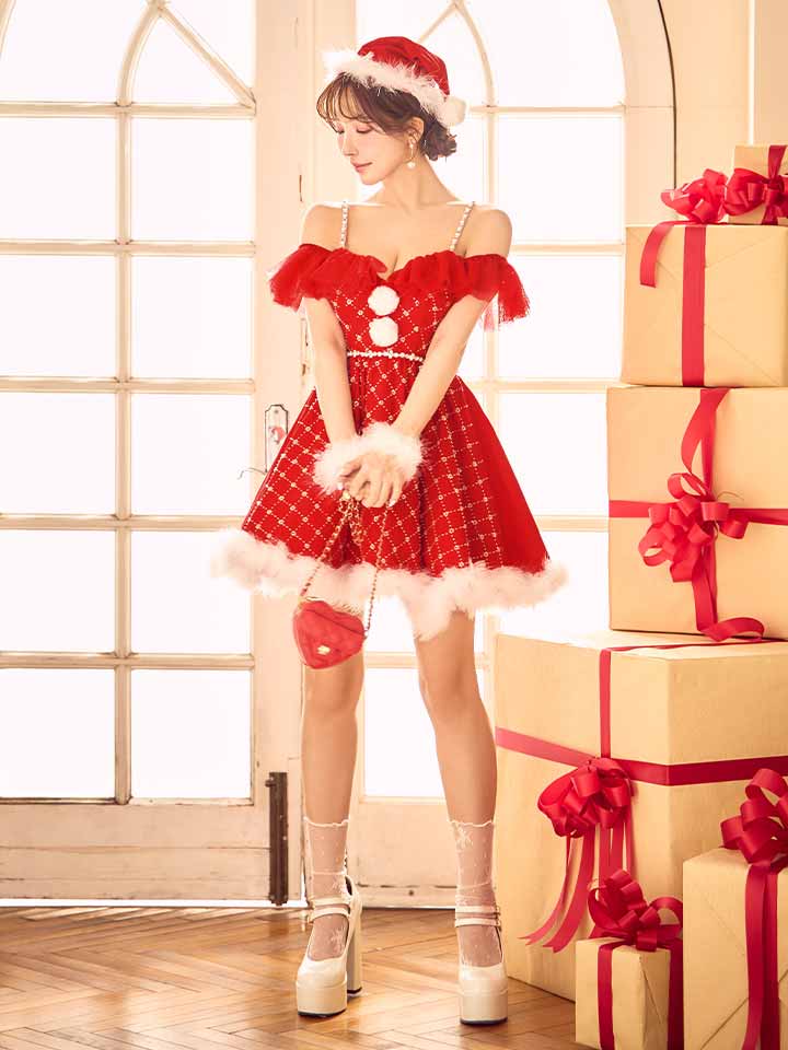 オフショルフリルサンタコスプレ。