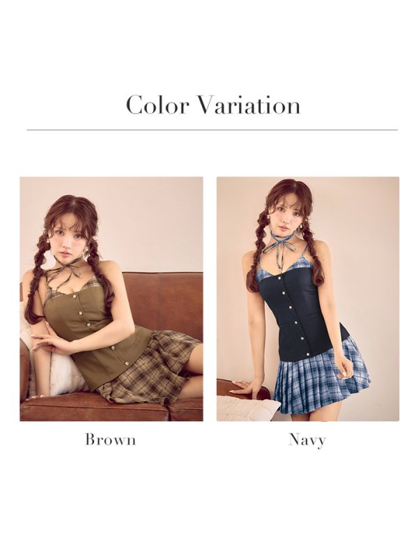 XSサイズあり【an /アン】チョーカーリボン付き/ キャミ/ チェック/ プリーツ/ レイヤード風/ フレア/ ミニドレス/ キャバドレス[OF05] [AOC3990-BR-S251008]