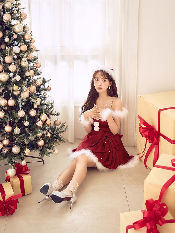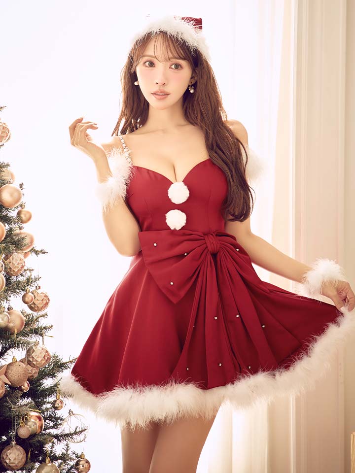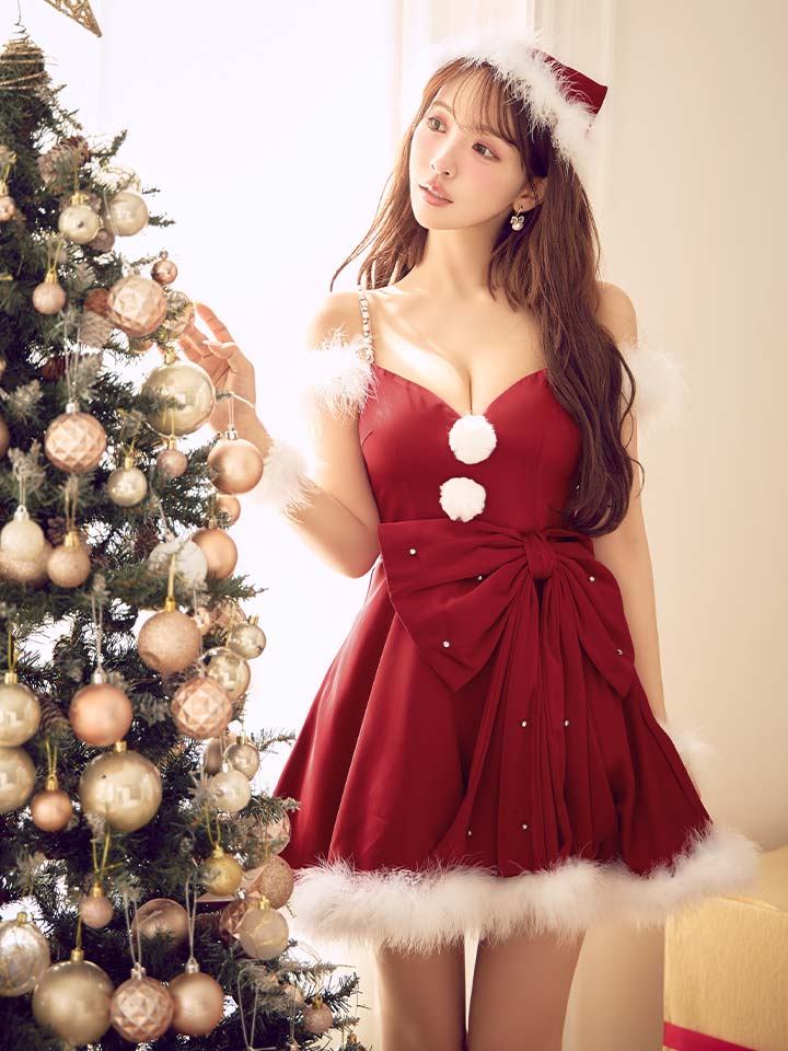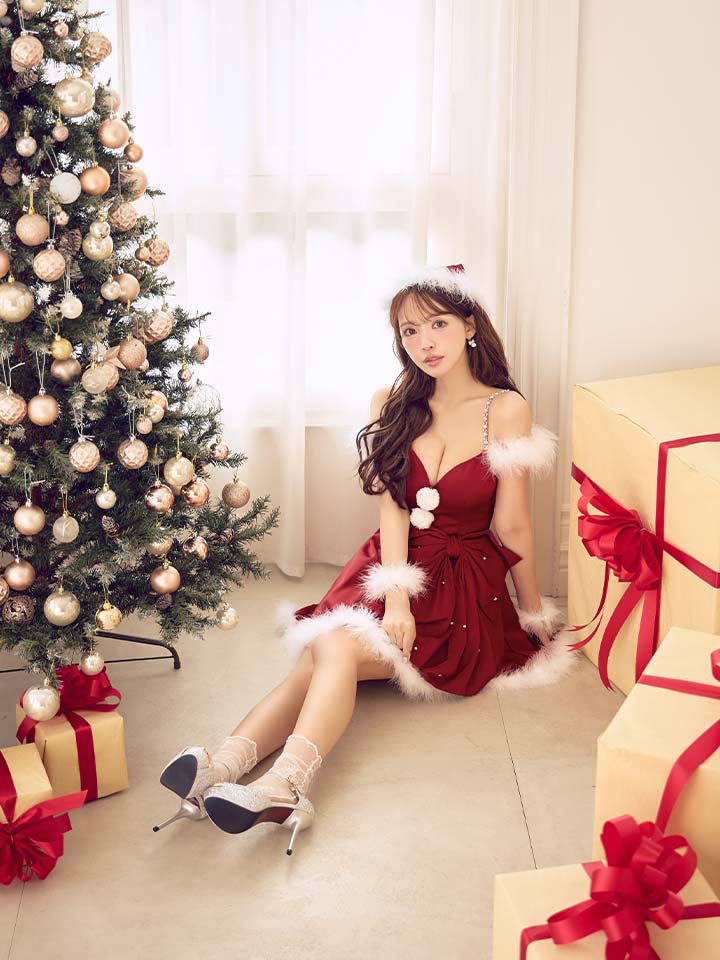 ビッグリボンが目を引くオフショルサンタコスプレ。