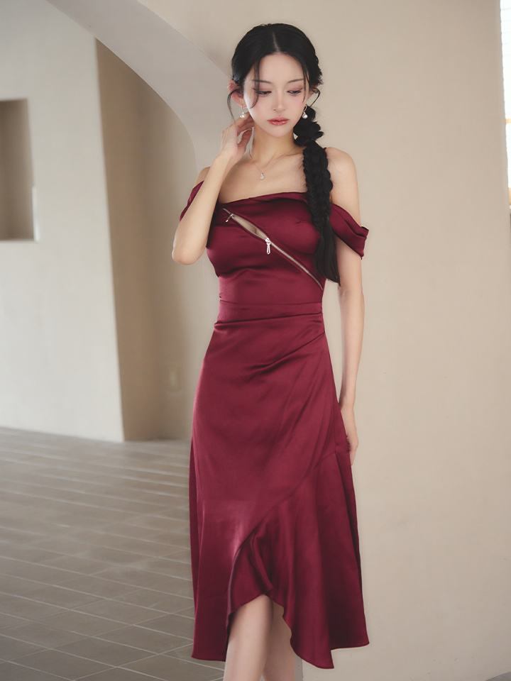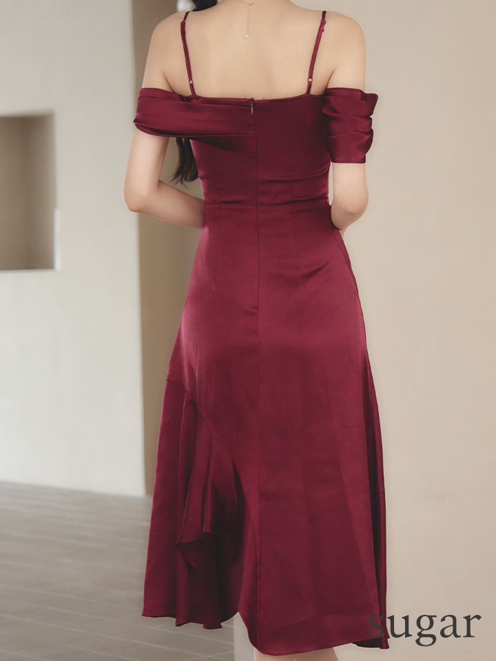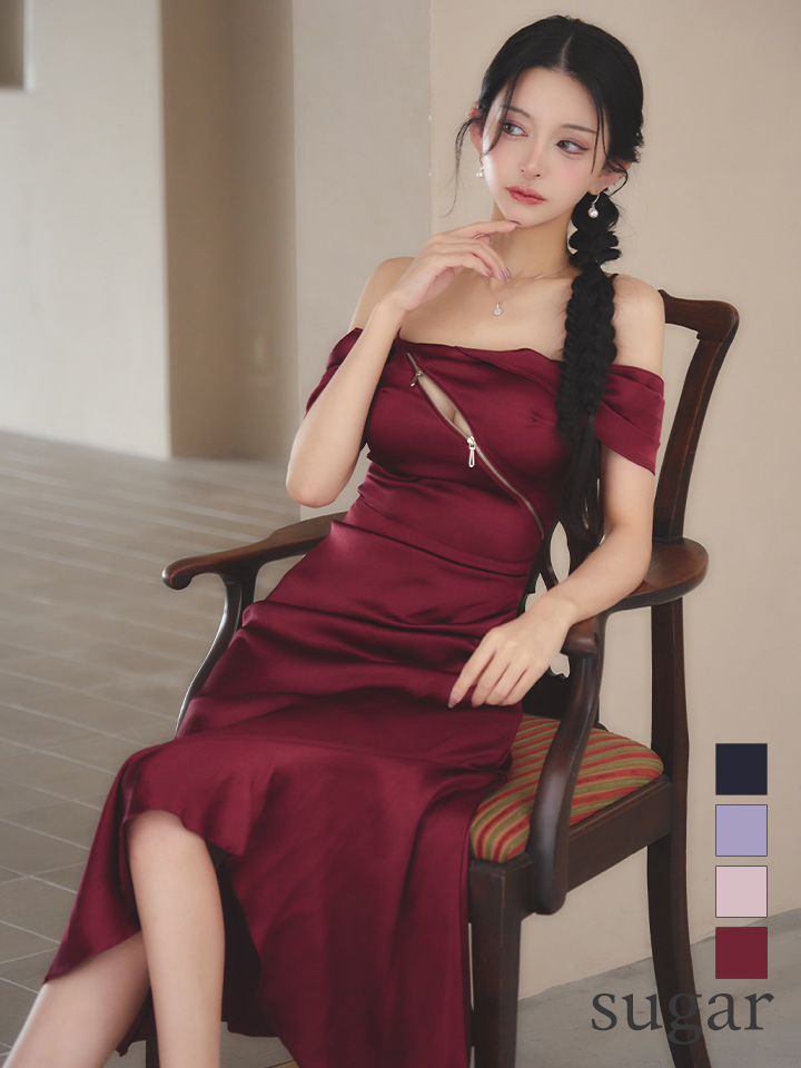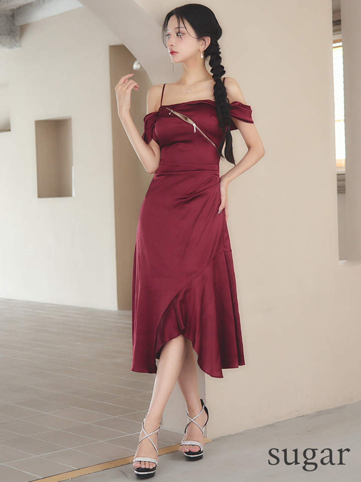 【ANDY/アンディ】フロントジップ/ ストレッチサテン/ オフショル/ キャミソール/ シンプル/ ワンカラー/ アシンメトリー/ フリル/ フレア/ ミディアムドレス/ キャバドレス[OF05] [ON2984-WR-S251010]
