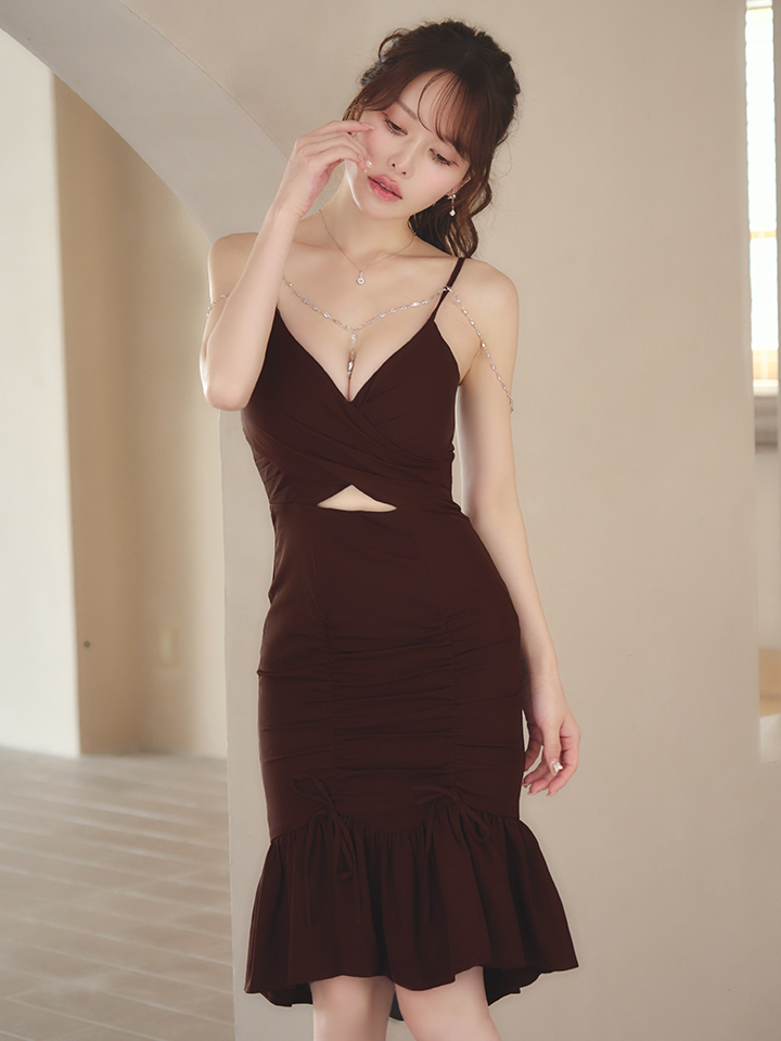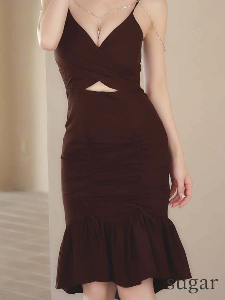 【Andy GLAMOROUS/アンディグラマラス】チャーム付き/ シンプル/ ワンカラー/ キャミソール/ ウエストカット/ ストレッチ/ フリル/ マーメイド/ ミディアムドレス/ キャバドレス[OF05] [GMS-V880-BR-S251010]