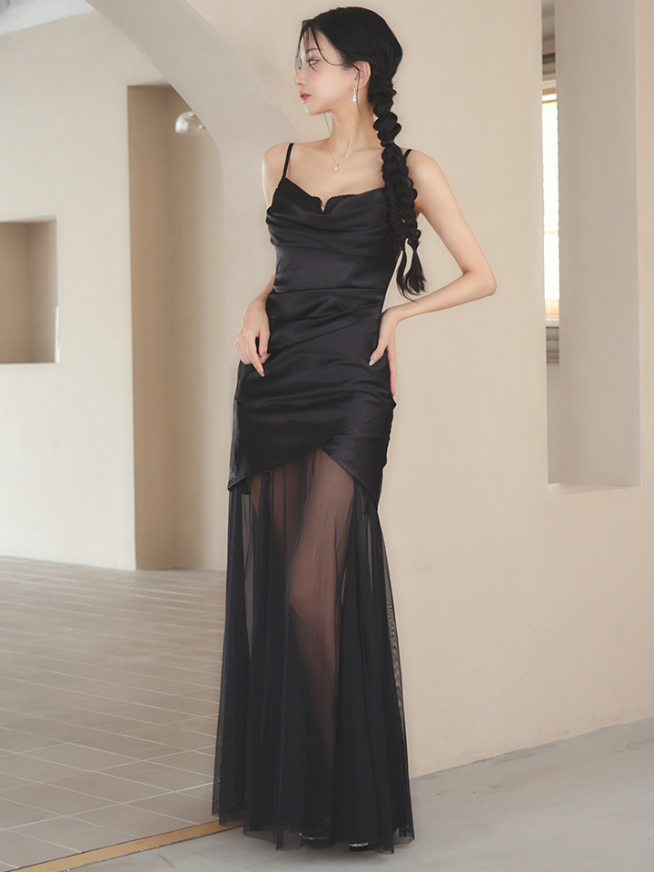 上品な光沢感のある生地でラグジュアリーな雰囲気を纏うロングドレス。