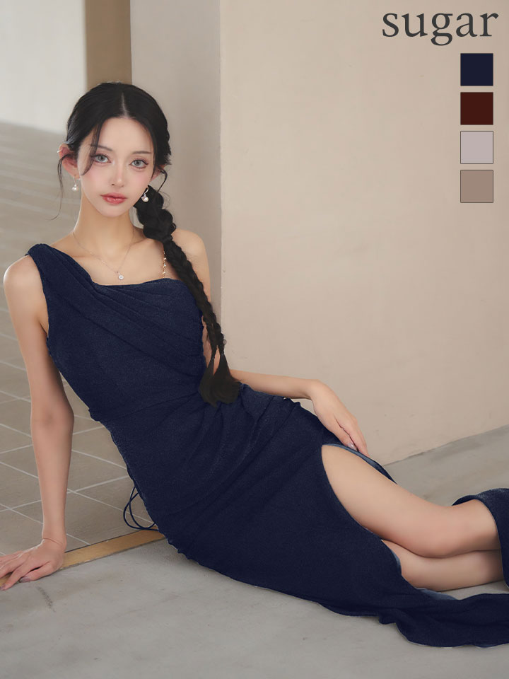ワンショルダーと長めのスリットから覗く素肌が大人の色気を醸し出し、
