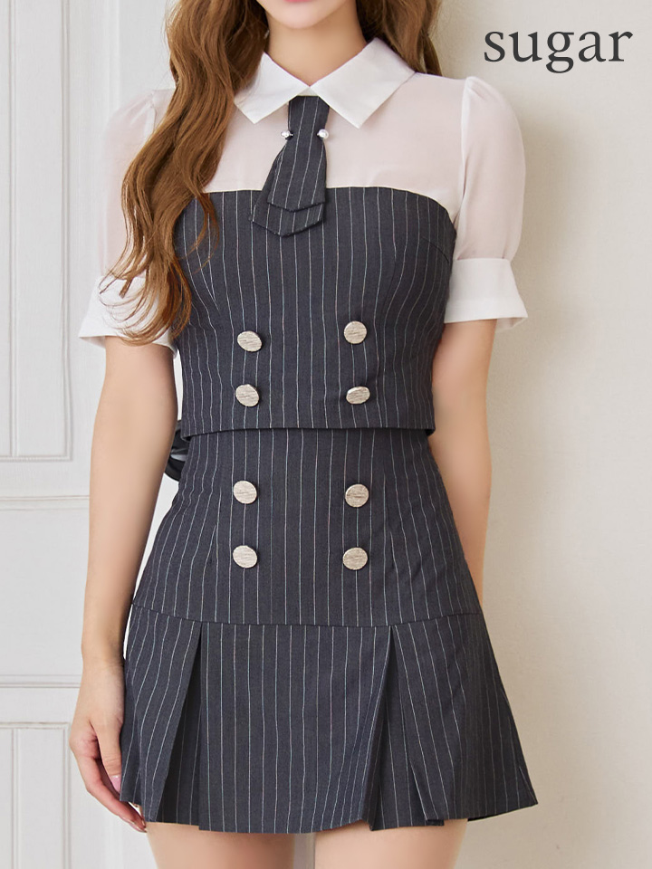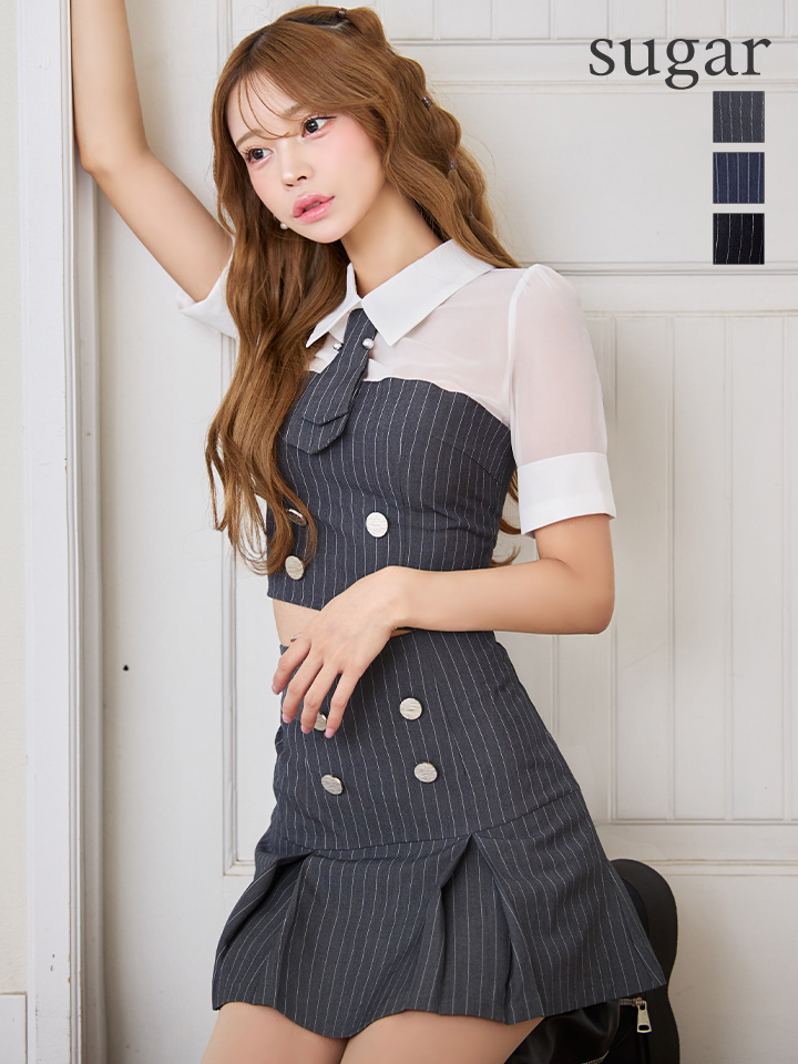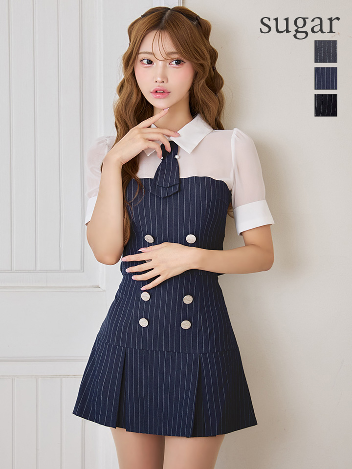 XSサイズあり【ANDY/アンディ】シャツ風/ バイカラー/ レイヤード/ ダブルボタン/ ストライプ/ ハーフスリーブ/ 袖あり/ プリーツ/ フレア/ セットアップ/ ミニドレス/ キャバドレス[OF05] [OK2983-B-S251011]