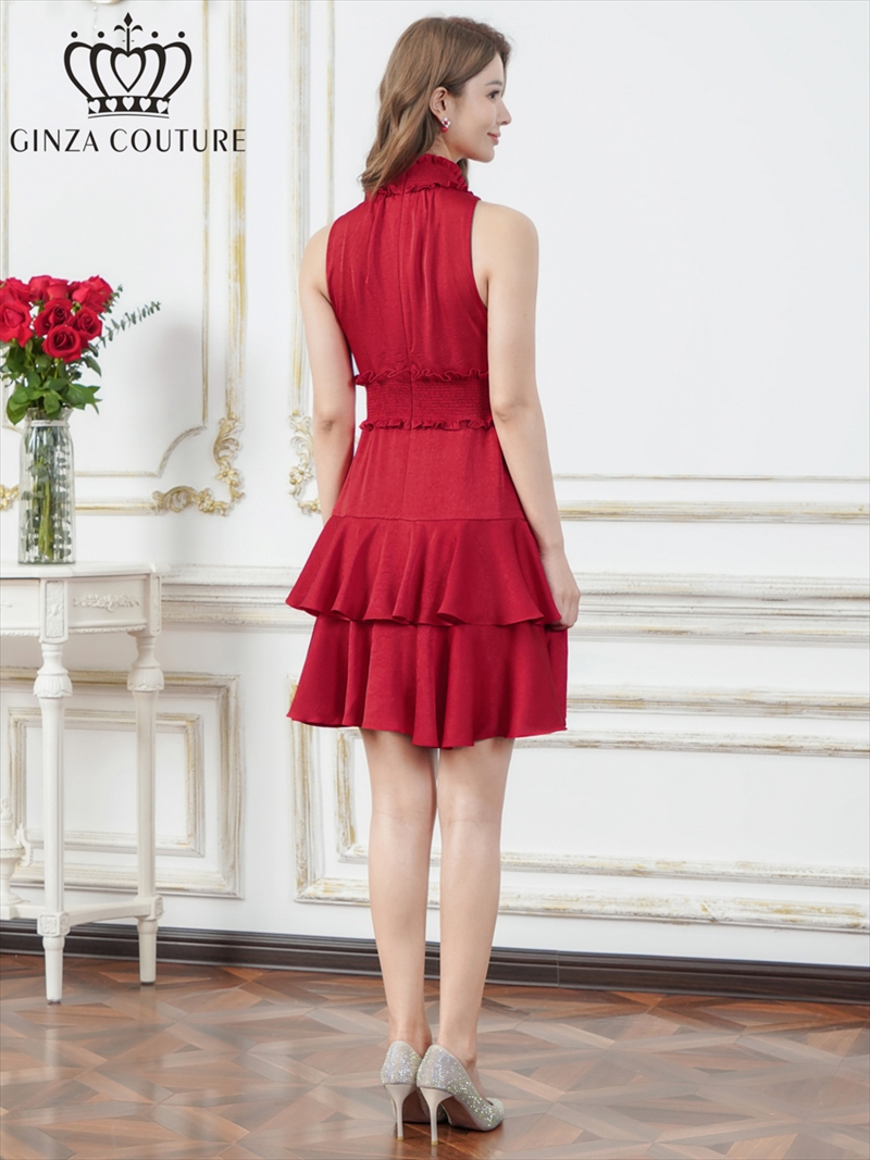 XS-Lサイズあり【GINZA COUTURE/銀座クチュール】フラワープリント/ シャーリング/ フリル/ ノースリーブ/ ハイネック/ Aライン/ フレア/ ワンピース/ ミニドレス/ キャバドレス[OF2] [LKC25129-W-S251015]
